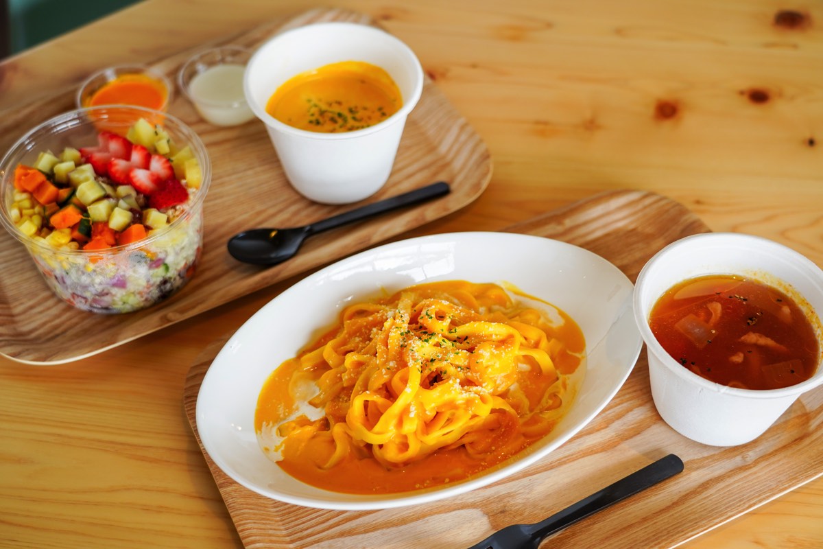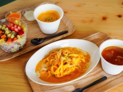 ランチには、10種類から12種類の野菜が入ったサラダと野菜パスタの2種類が揃い、選べるスープ付き。「赤」・「黄」・「緑」の3種類のパスタやスープ、スムージーには、それぞれの色の緑黄色野菜が入っている。