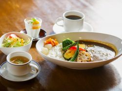 石和の名館「糸柳」直営の当サロンのカレーはブレンドスパイスとたっぷりの野菜でスパイシーかつフルーティーな風味が持ち味。