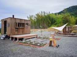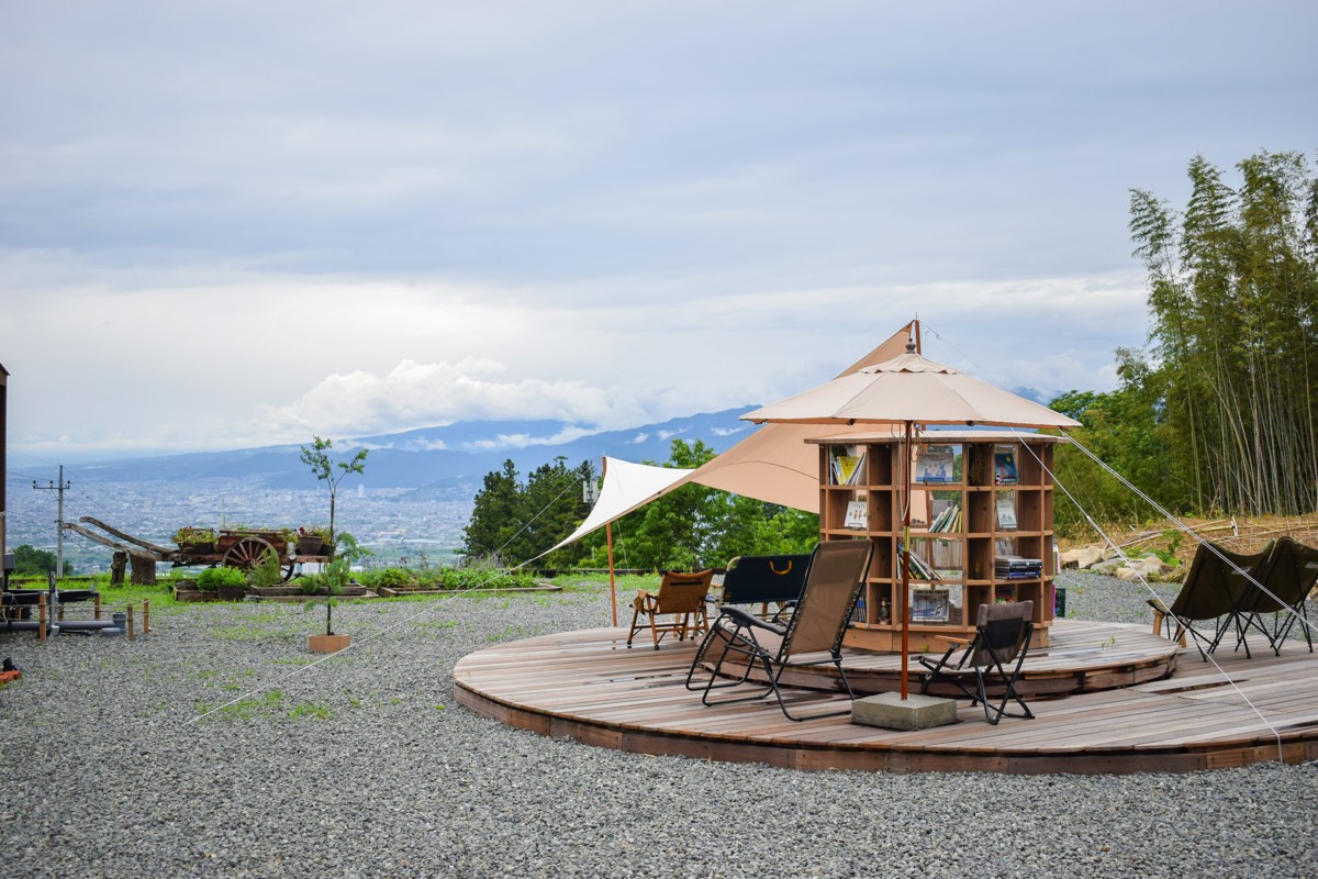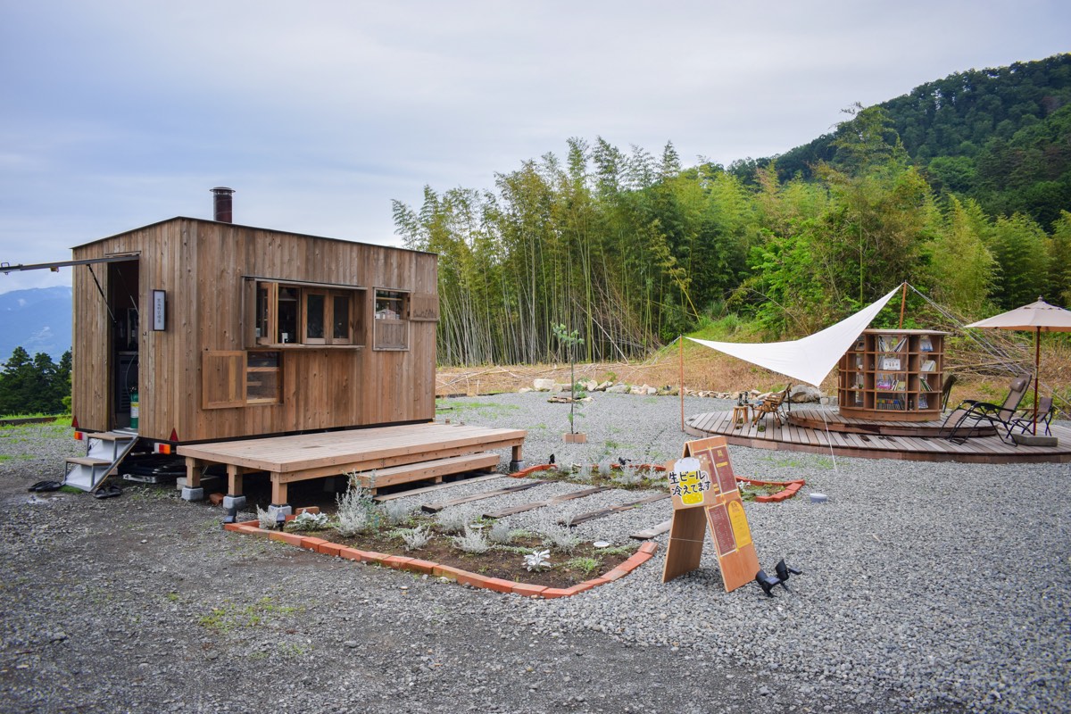 黒坂オートキャンプ場から少し進むと現れる円形のウッドデッキが印象的なブックカフェ・黒坂野営喫茶。