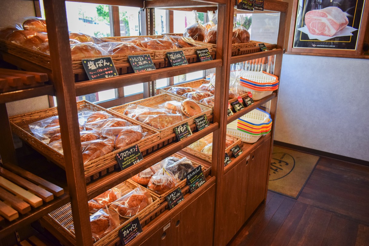 店内には種類豊富なパンが並び、べーカリーショップとして利用できるほか、ランチには甲州牛100%のボリューム満点ハンバーガーを、ディナーには肉汁溢れるハンバーグやローストビーフなどが楽しめる。
