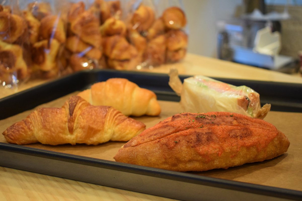 焼きたての手作りパンはクロワッサンや塩パン、カレーパンなどの定番から、サンド系までがズラリと並ぶ。