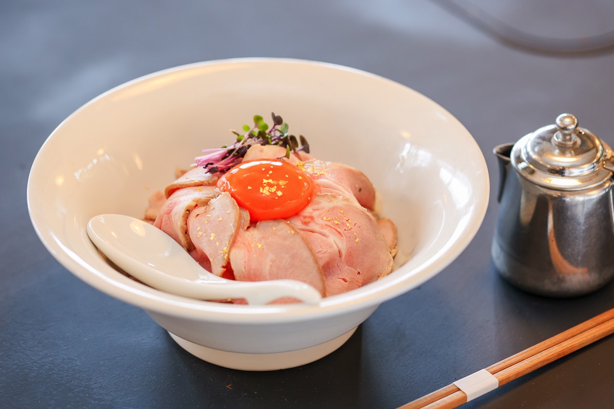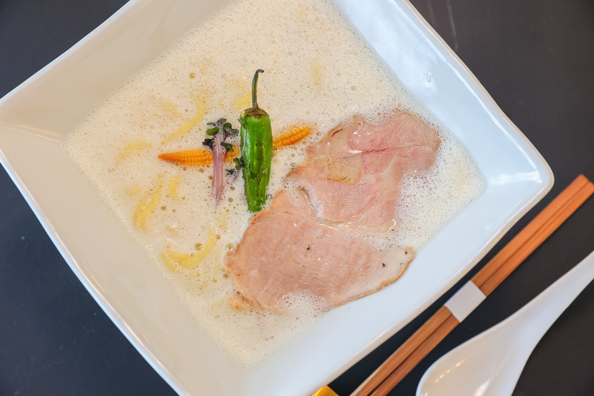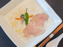 一方、地鶏の骨のみで作ったスープを泡立て、トリュフオイルで仕上げた濃厚鶏白湯ラーメンは、まるでフレンチのようだ。