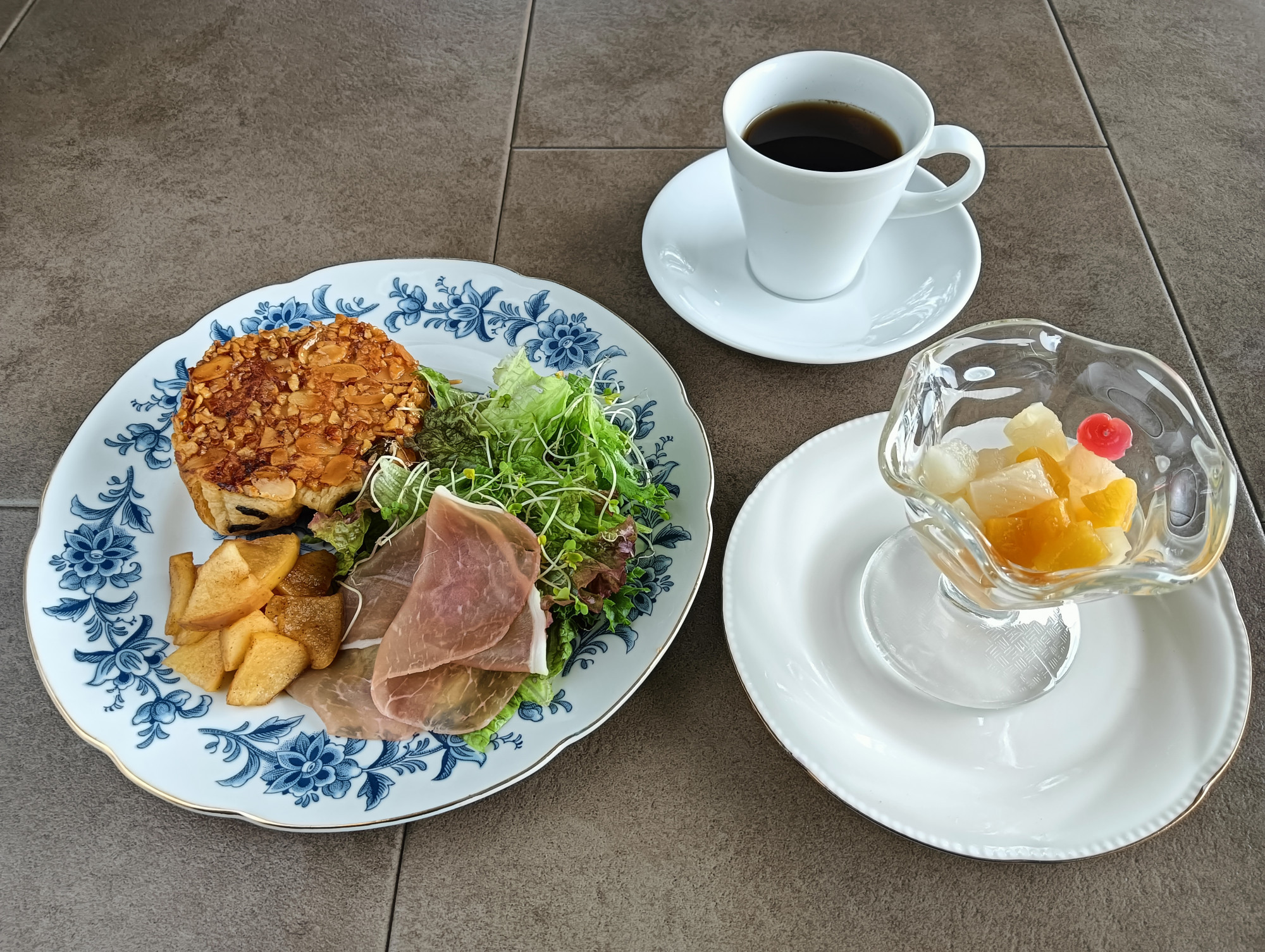 【本日のモーニング】880円(税込968円) ・デニッシュ オブ ショコラナッツ★ ・サラダ ・生ハム ・アップルシナモン ・フルーツカクテル お食事ご注文で コーヒー、紅茶は... -