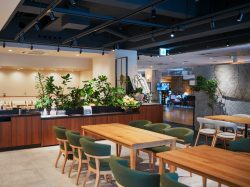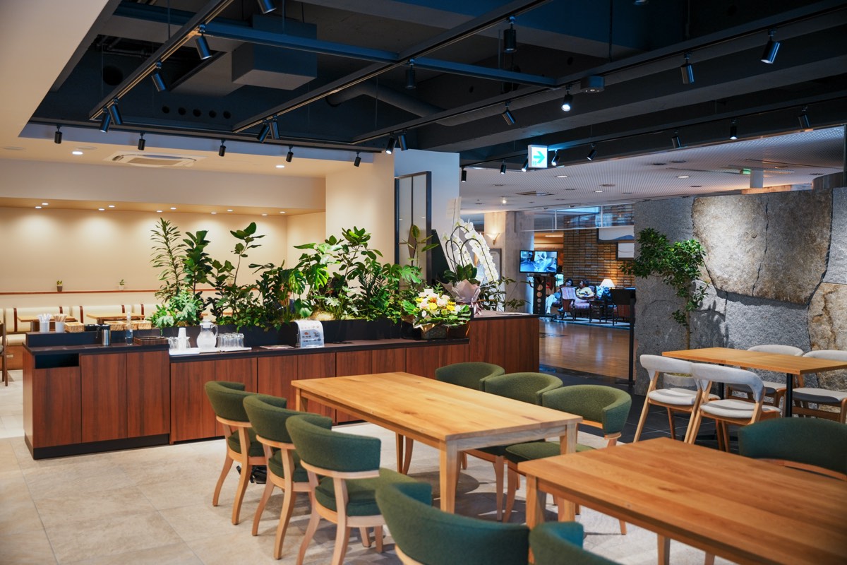 ビジネスシーンに活用できる明るい店内エリアと、落ち着いた雰囲気のくつろぎスペースとを植栽で2分し、思い思いの時間を過ごせる。
