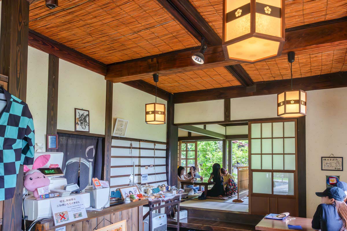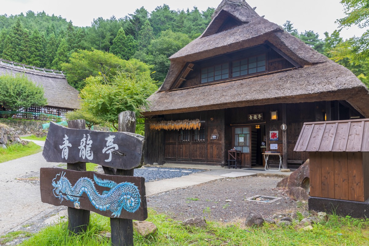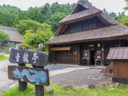 「茶処 青龍亭」は「西湖いやしの里根場」内にある甘味処。茅葺屋根の家々が立ち並ぶ美しい日本の原風景を散策しながら、ほっとひと休み。テーブル席のほか、靴を脱いでくつろげるお座敷やテラス席もあり、のんびりと思い思いの時間を過ごせそう。