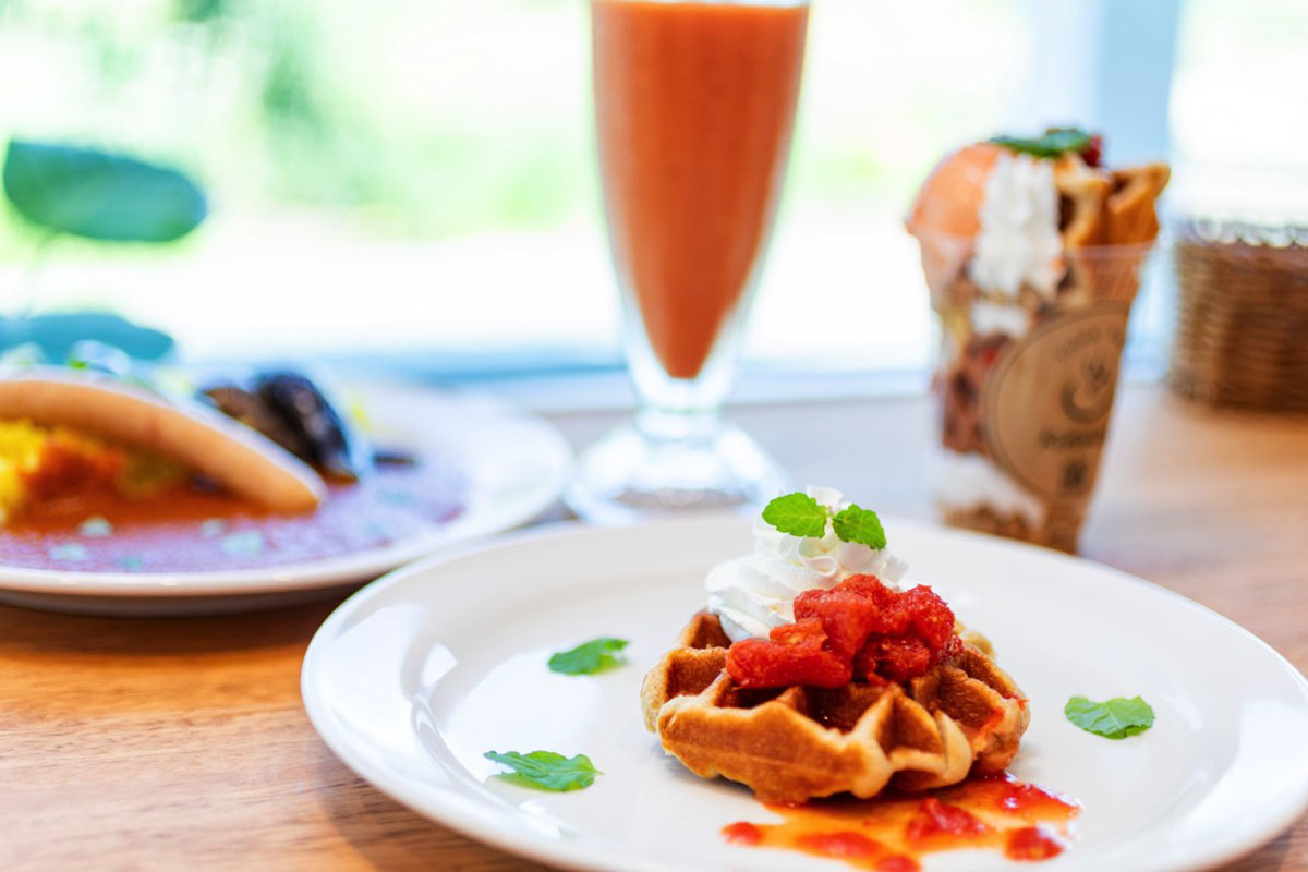水のかわりにトマトで煮込んだ「無水トマト糀カレー」や、トマト2.5個分がぎゅぎゅっと詰まった「トマトスムージー」、驚くほどクリーミーでスイートなトマトジェラートをのせたパフェなど、ここでしか味わえない逸品を堪能しよう。