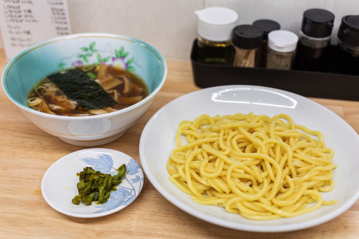 看板のつけそばに加え、しなそば、ラーメンの3種類がラインナップし、つけそばは太麺ストレート、しなそばは細麺ちぢれ、ラーメンは中太麺など、それぞれ違った麺で楽しめる。