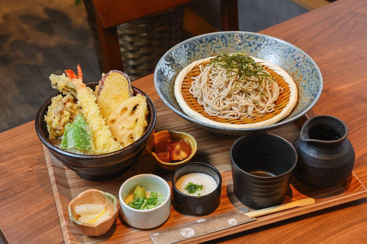 豊富なメニューの中でもお店イチオシは「囲炉裏特製そば御膳」。オリジナルの肉つけ汁と茸つけ汁から選べ、4種類の天ぷらや薬味、デザートも付いてボリューム満点に楽しめる。