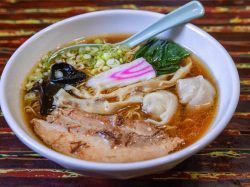 富士山麓の澄んだ水で作った平打ちのもちもち自家製麺に、醤油感のしっかりしたスープが自慢。