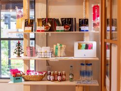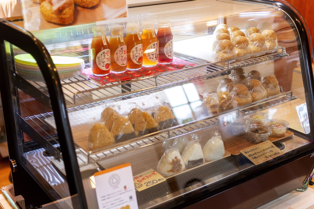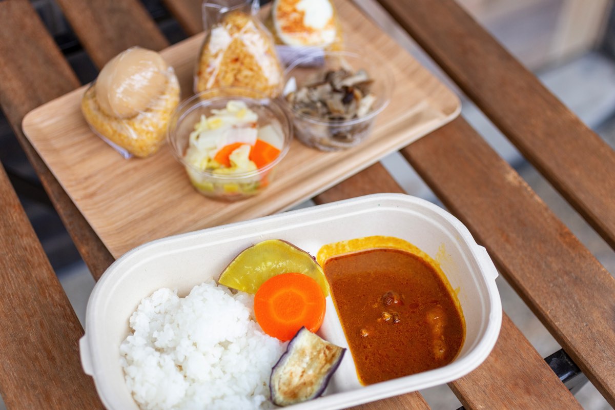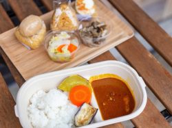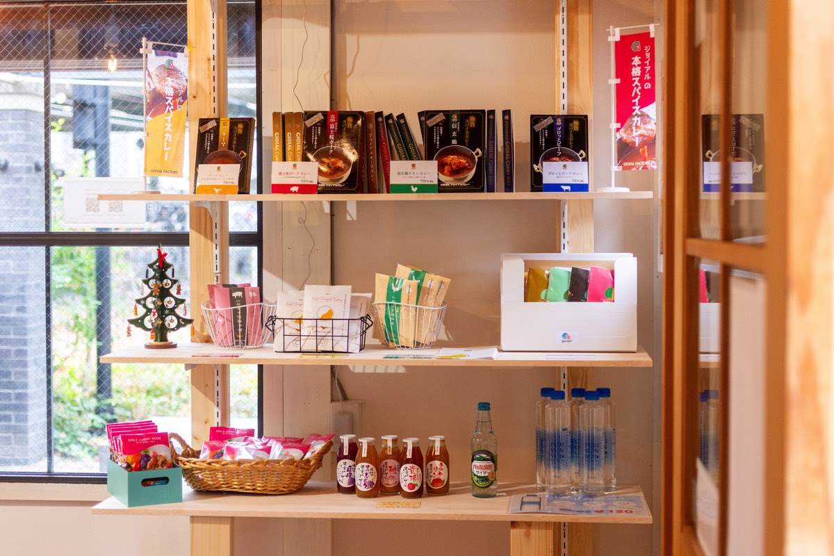 「やまなし里山キッチン」のカレーおにぎりやお惣菜のほか、山梨の農産物を使ったストーリーのある商品、ワイン、地ビール、お土産などが揃う。カレーライスのテイクアウトをはじめ、ランチから早めの夜まで、お買い物や外飲みも。