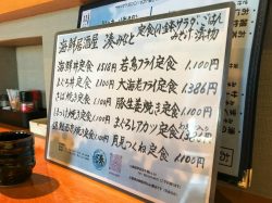 【昼】 ・まぐろ丼定食 1,100円 ・銀鮭西京焼き定食 1,100円 ・海鮮丼定食 1,518円 ・まぐろレアカツ定食 1,386円 【夜】 ・まぐろカツ 880円 ・ほたてバター焼き 770円 ・海鮮サラダ 1,320円(ハーフ770円) ・サーモンいくら丼 2,310円 |