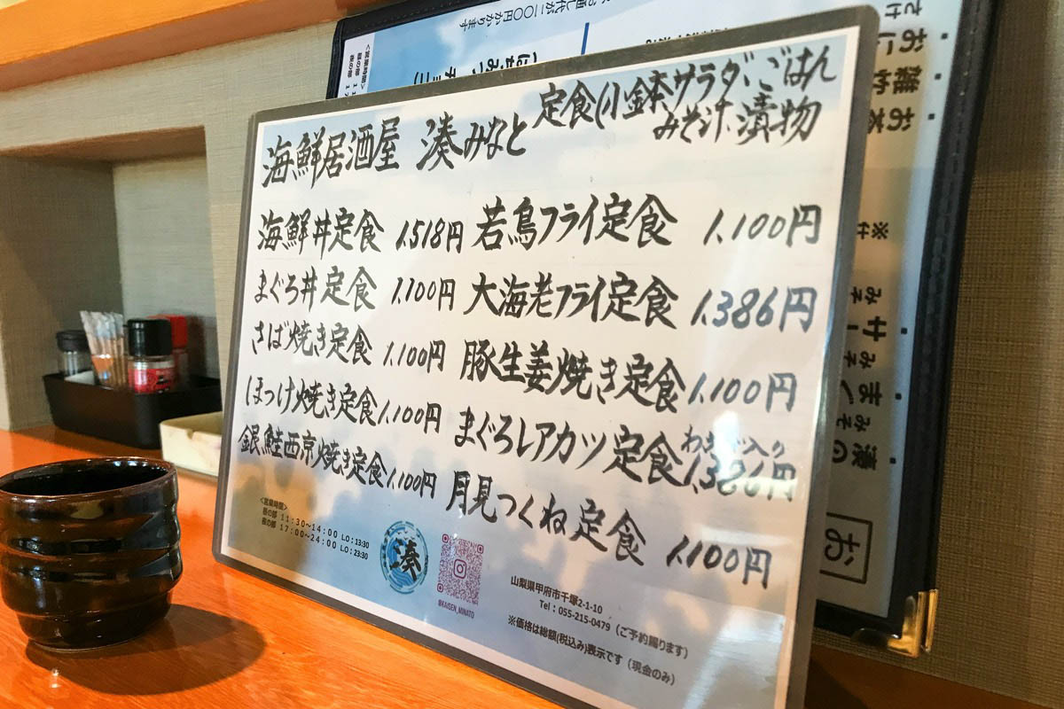 甲府市の「海鮮居酒屋 湊」は、昼はリーズナブルな新鮮魚介の定食が、夜は海鮮居酒屋としてお酒とおつまみが楽しめる。