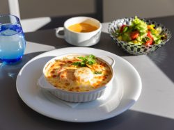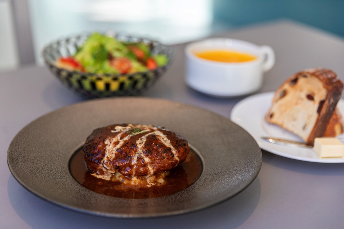 肩肘張らず気軽にフレンチを楽しめるようにとランチはあえてコースではなく、ハンバーグやドリアなどのセットメニューがラインナップする。