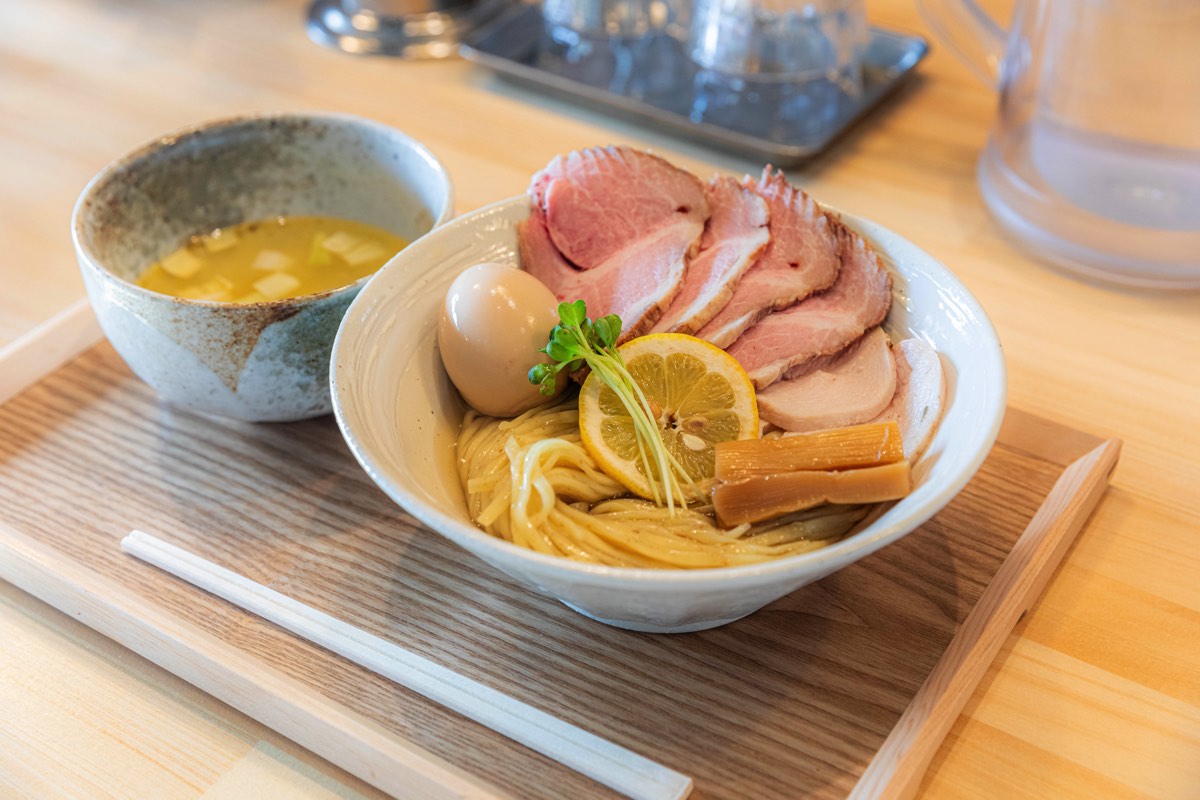 メニューは昆布水つけ麺と鶏らぁ麺を主軸に、それぞれ醤油・塩で展開。昆布をたっぷり使った昆布水つけ麺は、つけ汁をつけなくてもつるつるといけちゃうと大評判!親鶏の挽肉からとった出汁をベースにしたスープは、鶏の旨味に溢れ絶品だ。