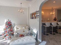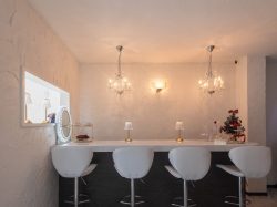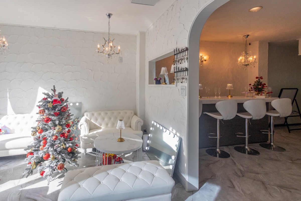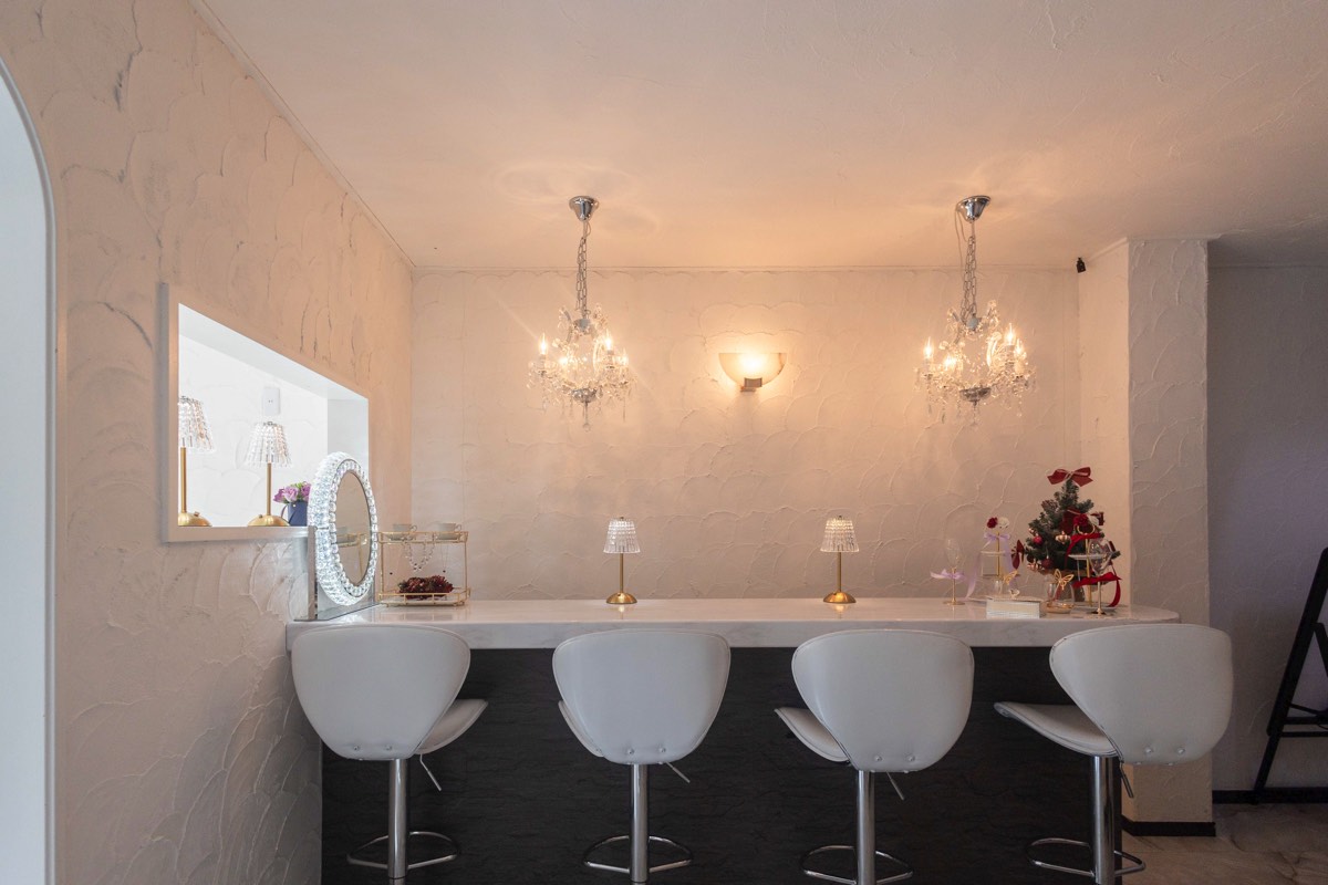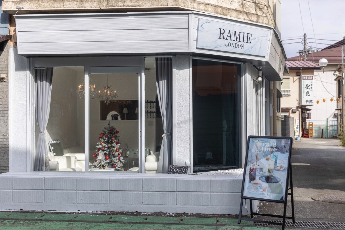 富士吉田市の月江寺駅すぐそばにあるカフェ&バー「RAMIE LONDON luxury cafe & bar」。真っ白な店内はキラキラ輝くインテリアで、まるでお城のような空間が広がる。