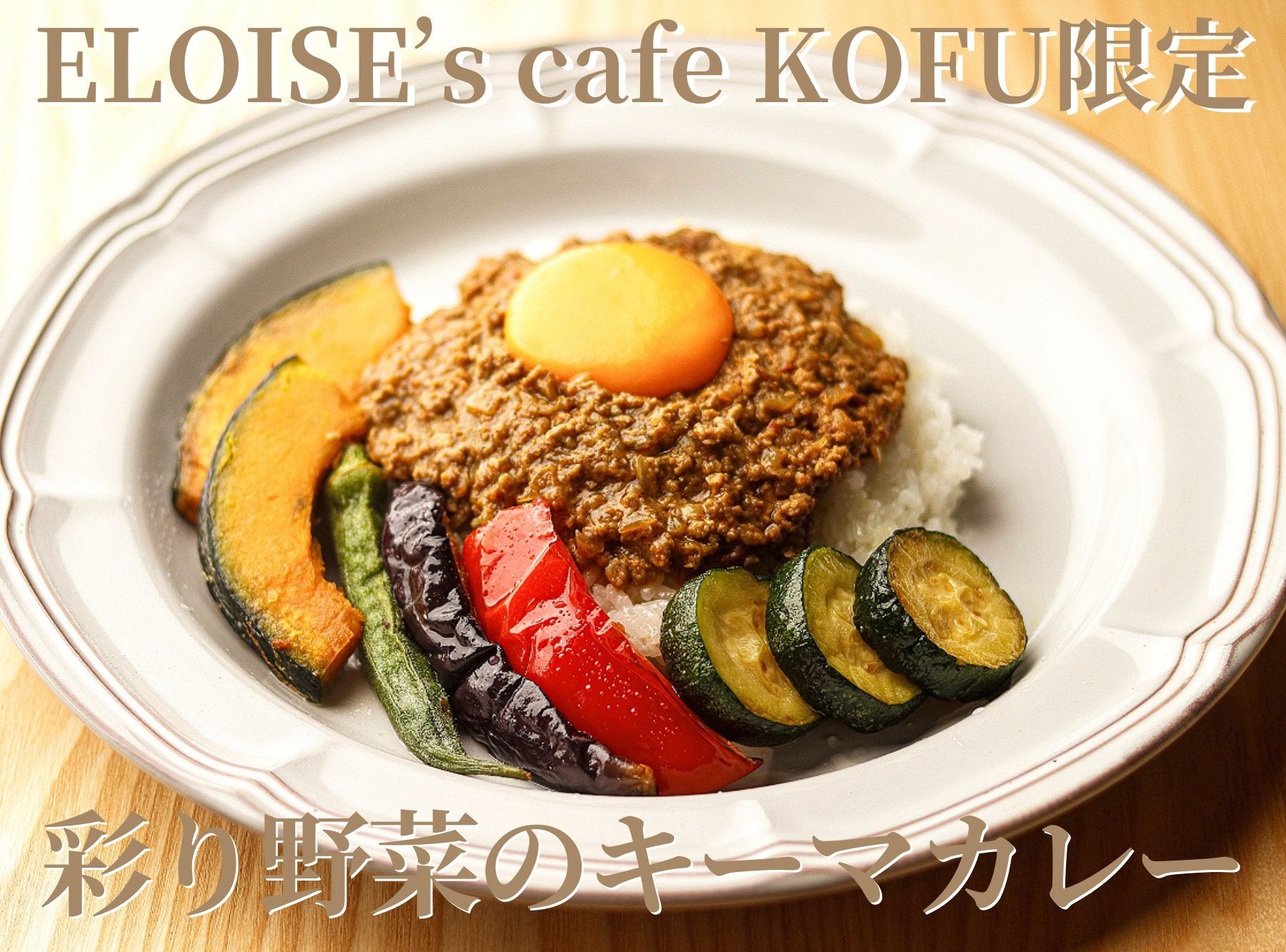 ELOISE's cafe KOFU限定で 彩り野菜のキーマカレーが新登場! 30種類以上のスパイスが決め手の ピリッとしたキーマカレー。 野菜がたっぷり摂れるのも嬉しい ...