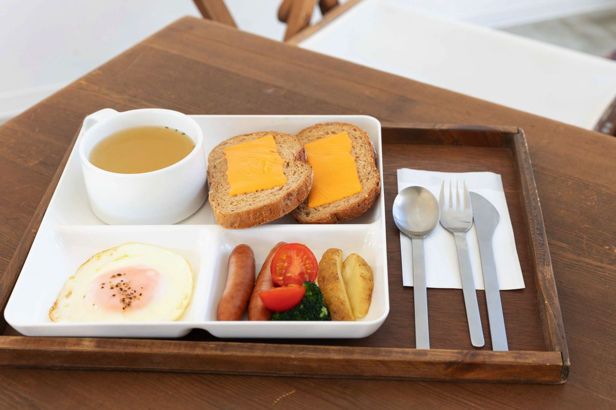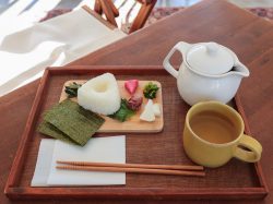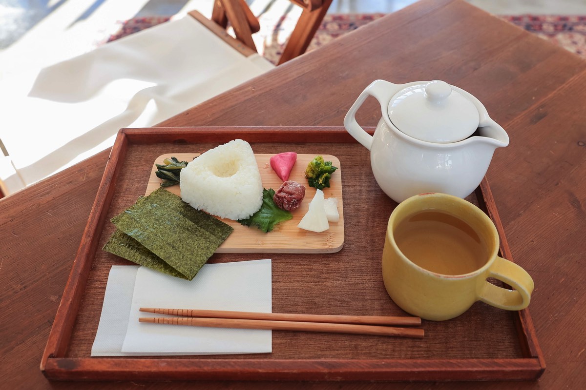 ドリンクのほか軽食メニューもあり、おにぎりプレートは手作りの付け合わせや漬物など様々な具材でオリジナルおにぎりを楽しめる。