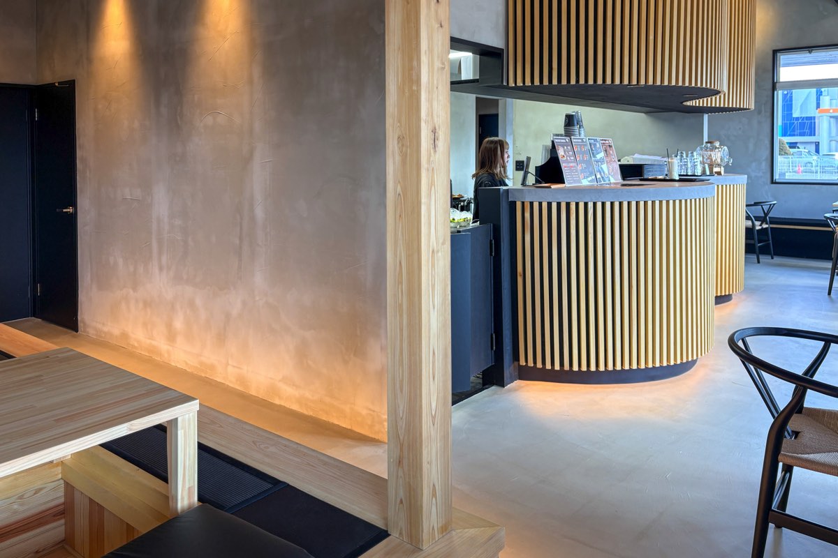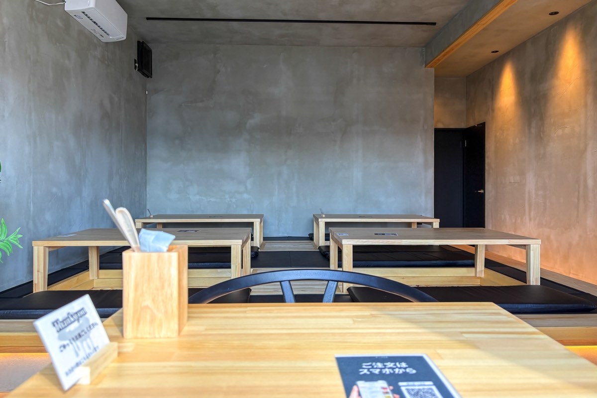 白木とグレー&ブラックで統一された落ち着いた店内は居心地がいい。スタイリッシュながらお座敷も完備し、子連れでもくつろげる。