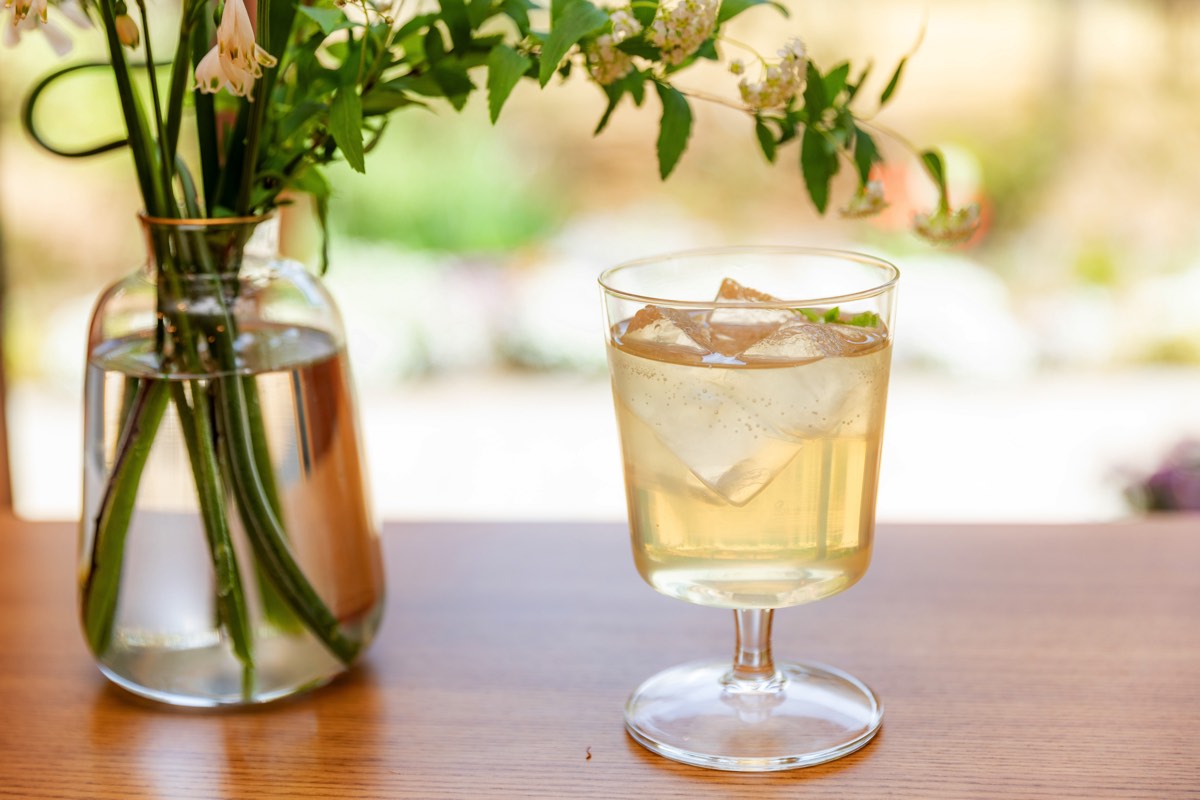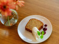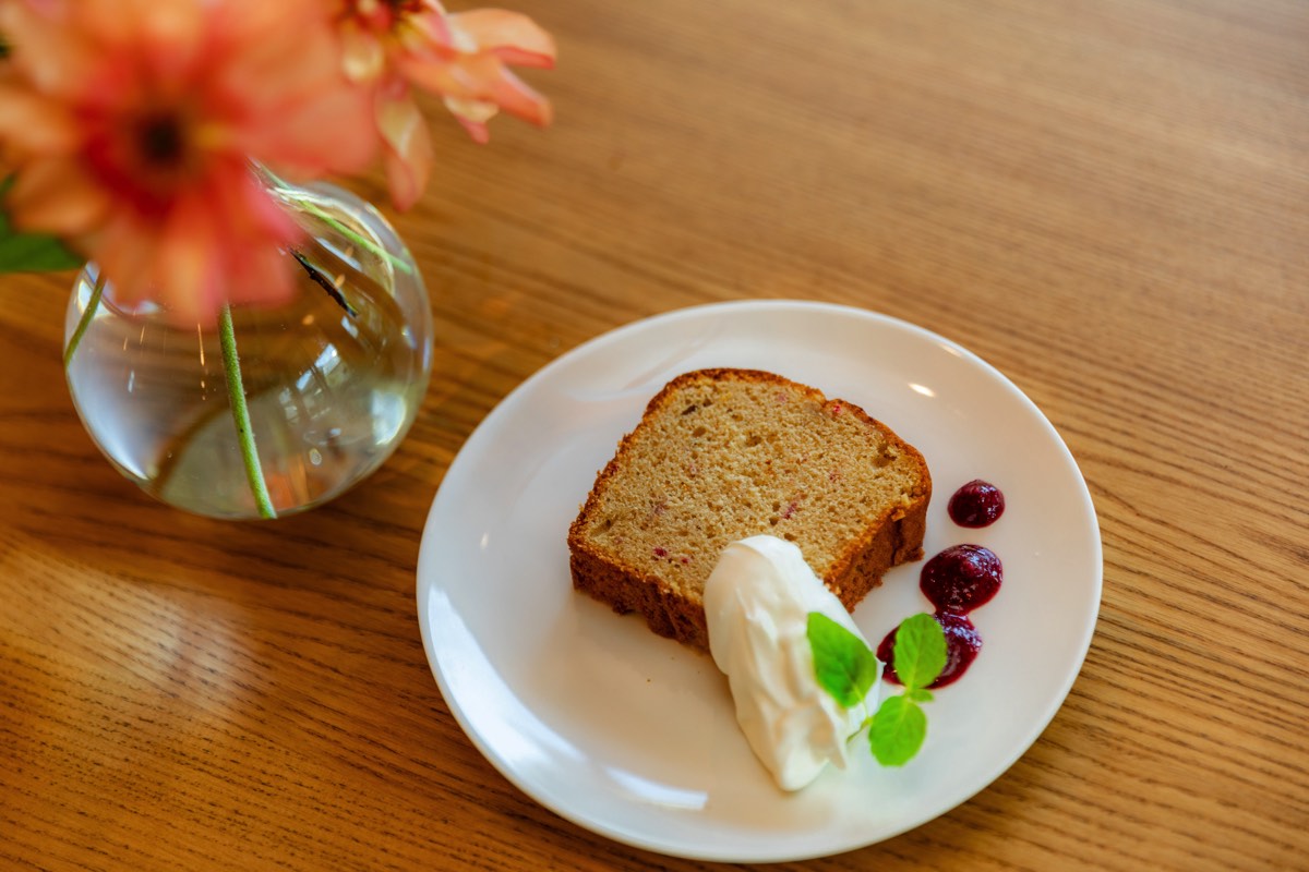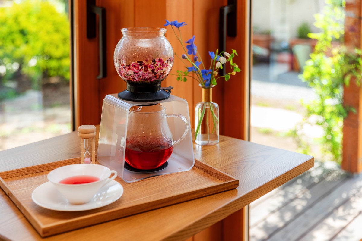 白州にある自社農園で、無農薬で大切に育てた有機栽培のバラの花びらを摘み取り、お茶やお菓子に…。おすすめは、バラと煎茶をベースにしたブレンド茶「ロザ フルリ」。ガラスポットの中で香り高く、お花が湯に抽出されていく様子は何とも優雅だ。