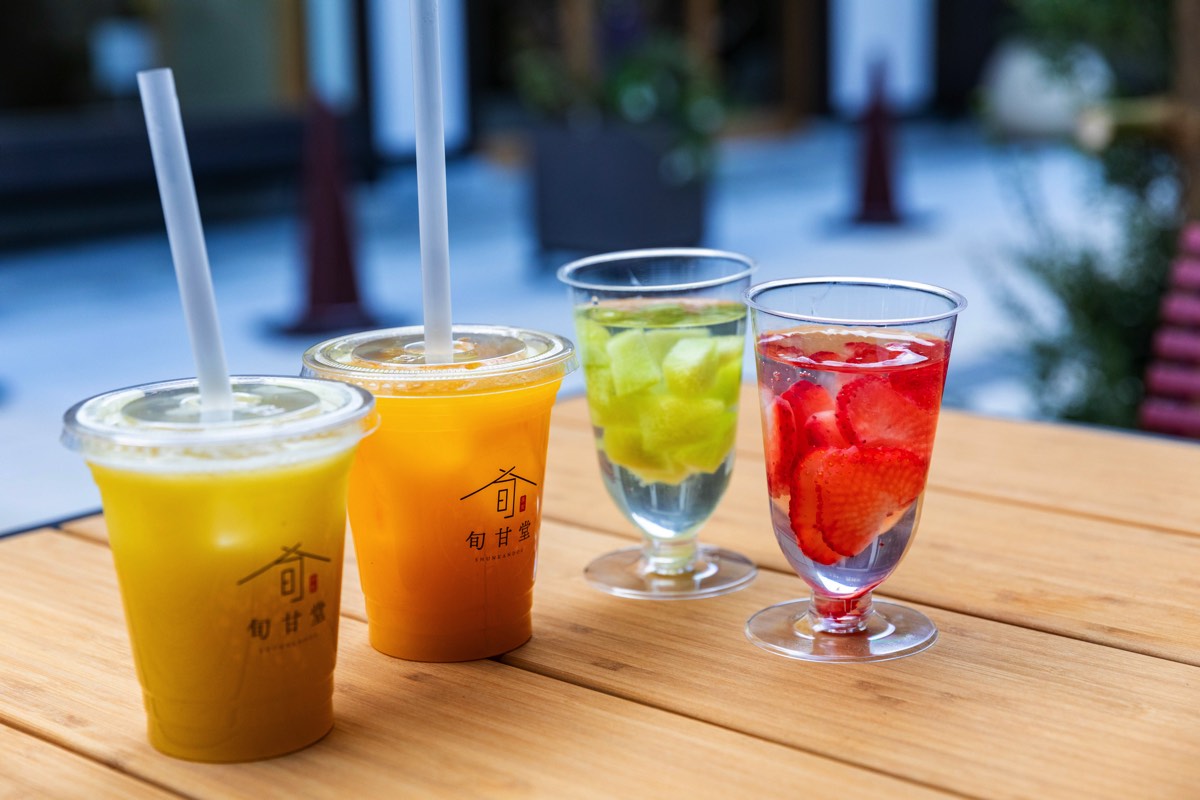 小江戸甲府花小路内にある「果実処 旬甘堂」は富士山の湧き水を使用した生フルーツゼリーをはじめ、生果実を目の前で搾ってくれるフレッシュジュースなどが楽しめる。