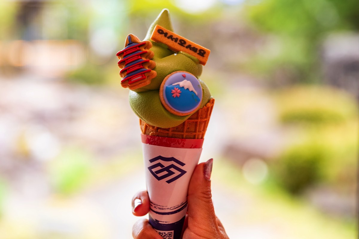 2階のお座敷からは富士山が望め、甘味やお食事を楽しみながら、ゆったりとひと休みできる。かわいいアイシング付きのソフトクリームもぜひ。