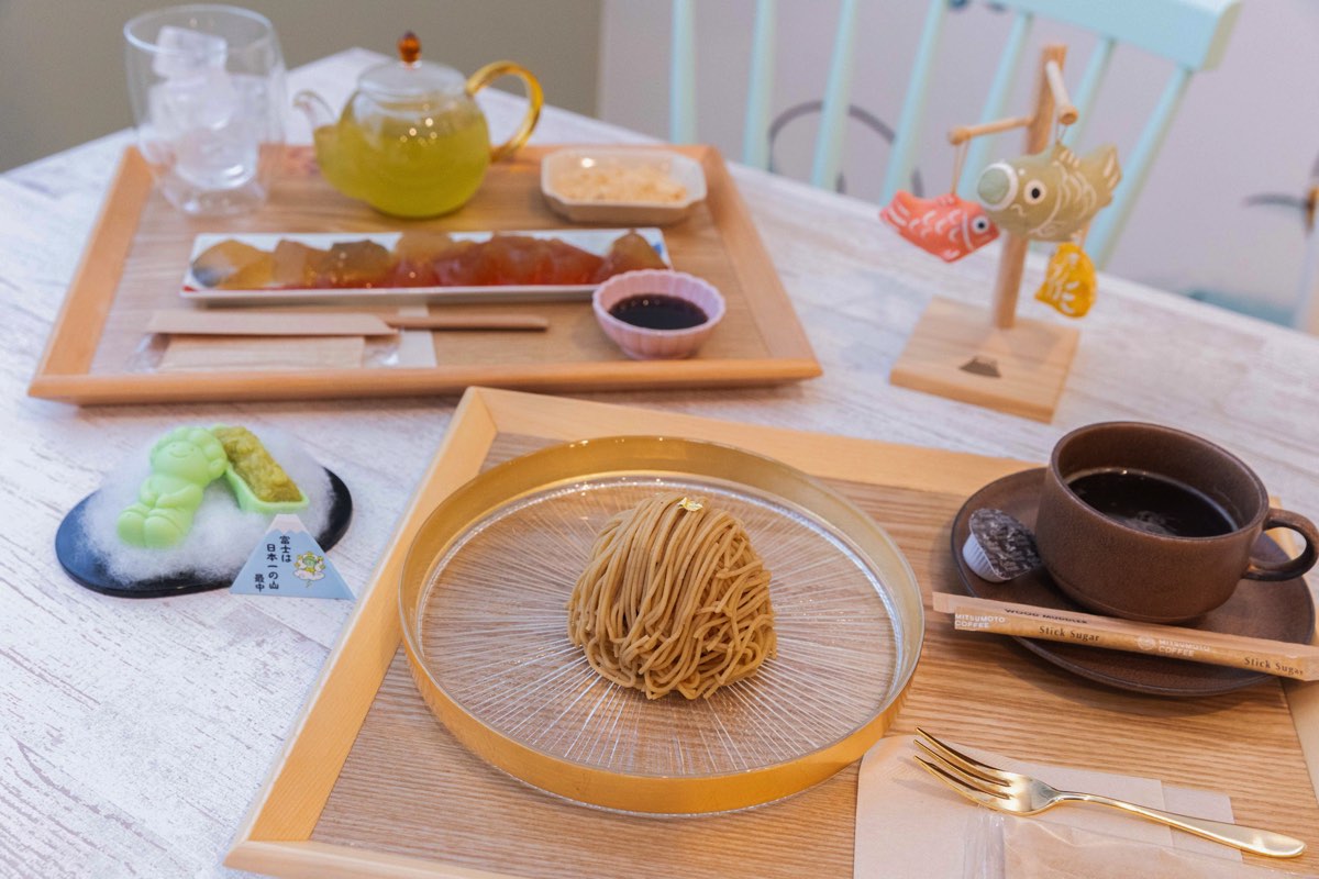 ・富士は日本一の山もなか 1個230円 ・富士は日本一の山どら焼 1個280円 ・たまてばこ 1個550円 ・わらび餅 600円/セット 1,050円 ・和栗モンブラン 800円/セット 1,250円 ・あんみつ 550円/セット 1,000円 ・かき氷 1,200円~ ・コーヒー(ホット/アイス)500円 ・和紅茶(ホット/アイス)500円 |