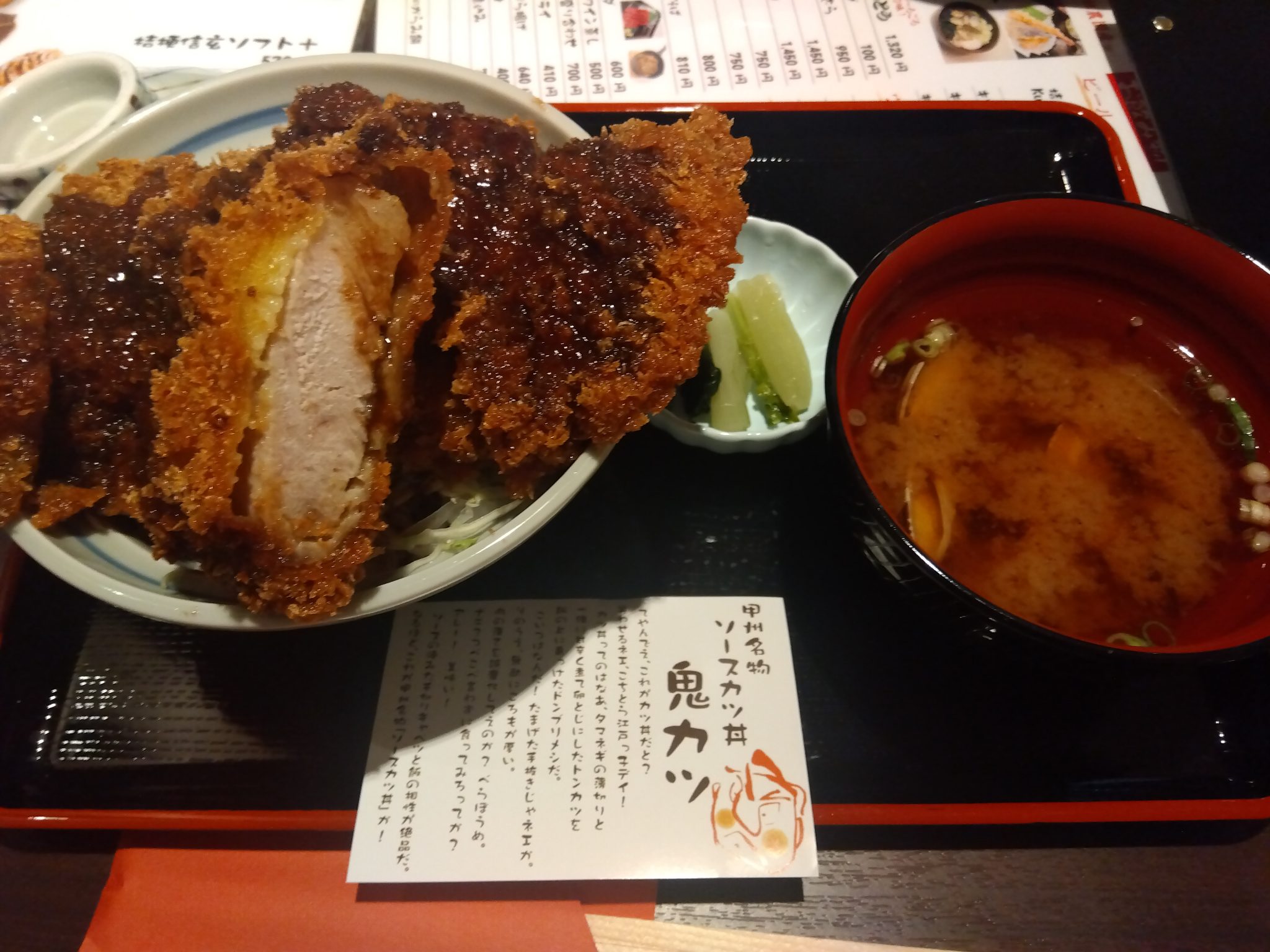 花小路の中にあるレストランで、とても雰囲気の良い所でした。「甲州名物ソースカツ丼鬼カツ」は物凄いボリュームのあるカツに濃いソースがたっぷりかかっていました。本当にガッツリメニューって感じで、ザクザクの衣、厚い富士桜ポーク、食べ応えのある料理でした。あさり汁は、あさりが大きくて、味噌も美味しかったです。