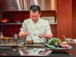 生産者の思いもダイレクトに伝えたいと、オープンキッチンを囲むようにカウンター席を配し、目の前で見事な手さばきを眺め、五感で至福の料理を楽しめる。