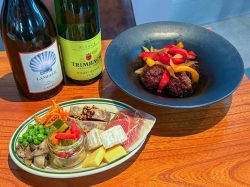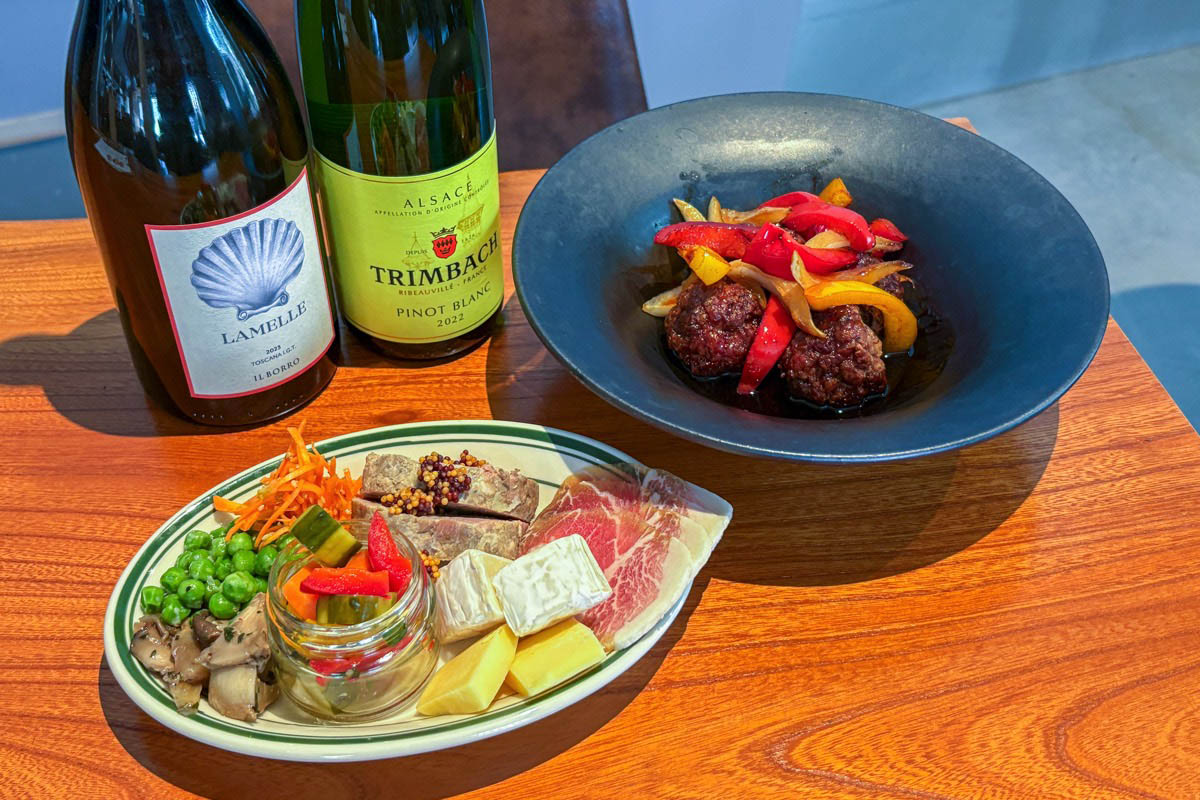 ディナーには、豚中心のアラカルトや料理と好相性のワインが随時60本ほど並ぶ。また、テイクアウト限定のメンチカツもあり、食べ歩きにも◎。
