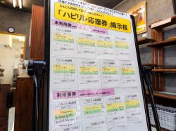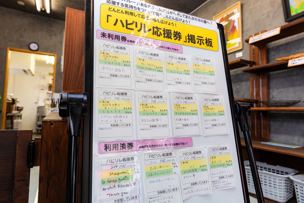 訪れた人は貼りだしてあるハピリレ券を利用して、カレーを食べられる。こうして繋いだ恩送りのリレーで、幸せのおすそ分けをする取り組みだ。