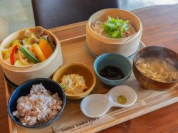 野菜がふんだんに摂れる体に優しいメニューを主軸に、朝は焼きたてのグルテンフリーの米粉パンでお出迎え。イチからすべて手作り!という美味しい料理が心も体も癒してくれる。