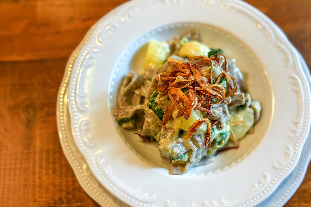 アルプス山脈に囲まれた渓谷地帯のそば粉を使った素朴な味わいにほっこりと和む。そばを実から製粉したこだわりの料理や自家製パン、手作りスイーツをぜひ。