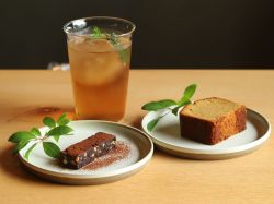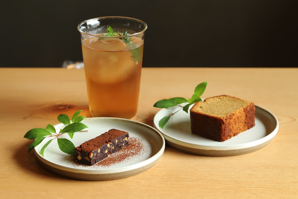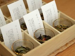 森をイメージした春夏秋冬のブレンドを楽しめる草木茶と小菓子のほか、黒文字の香るオーガニックオーツチャイや緑茶ブレンドなどが楽しめる。
