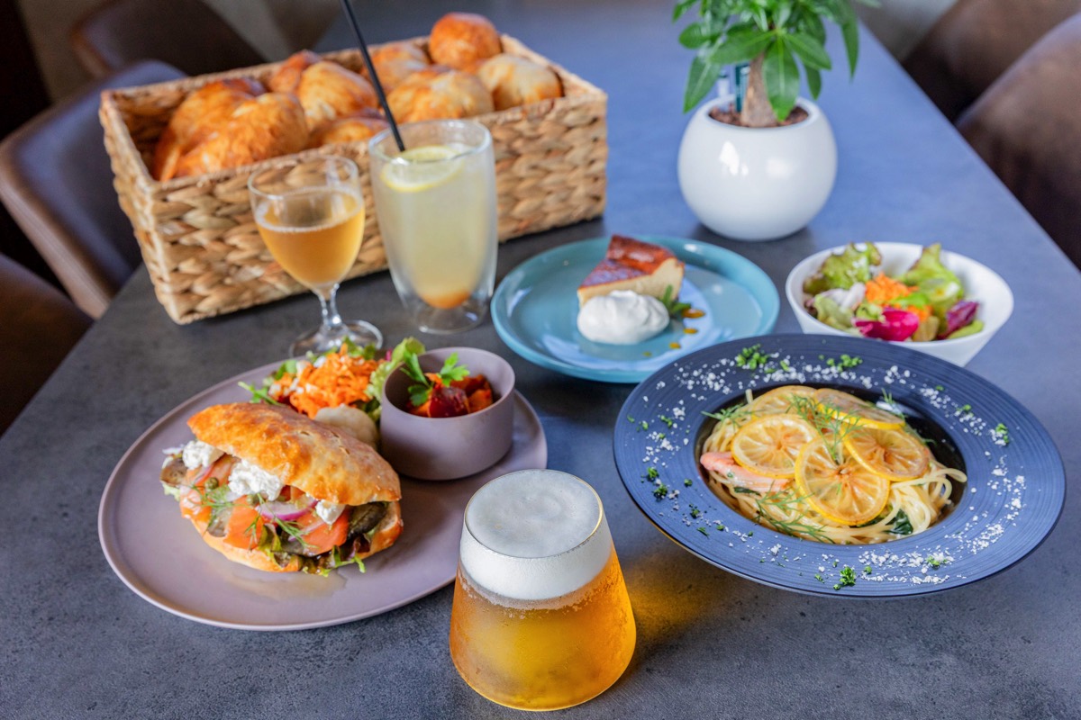 自家製高加水パンのサンドウィッチプレートやパスタなどカフェごはんを楽しみながら、リゾート気分を満喫できる。