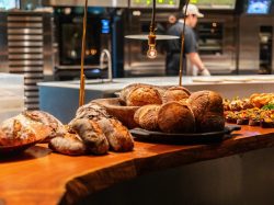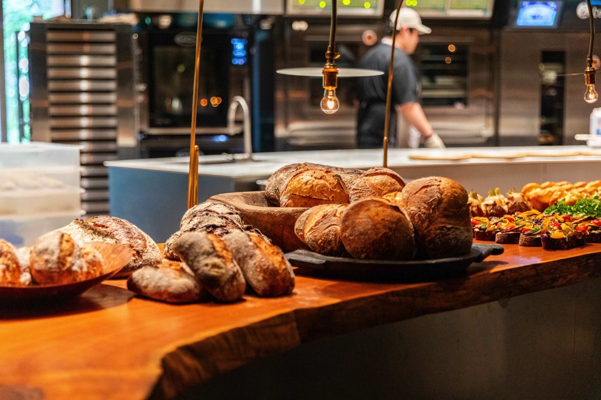 ラボ機能を備えるベーカリーでは水にとことんこだわり、約40種類のバラエティに富んだパンが並ぶ。