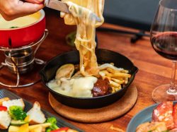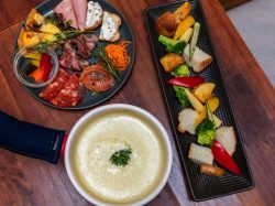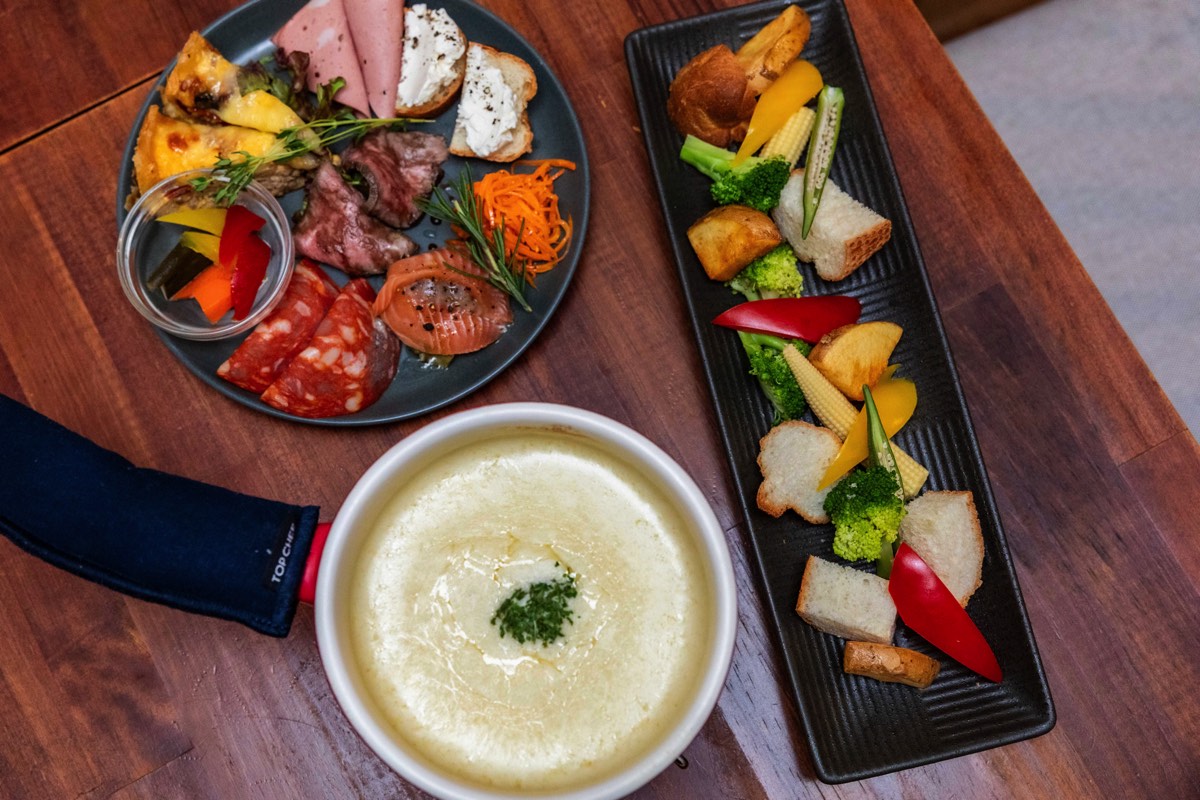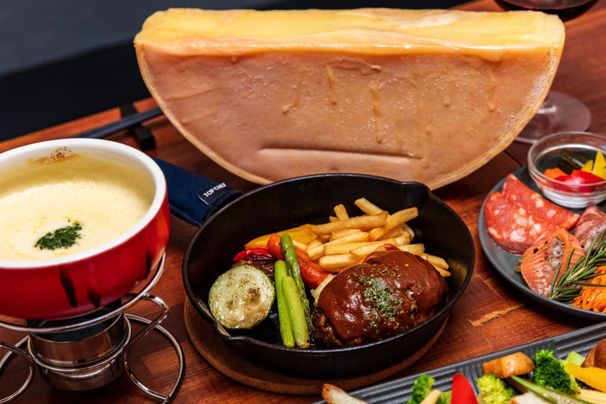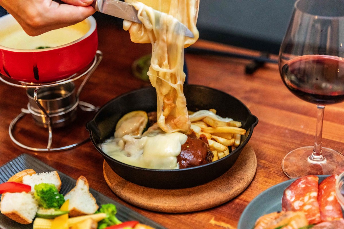 甲府グルメ横丁内にある「もんつの台所 M’s kitchen(エムズキッチン)」は、北海道花畑牧場のラクレットチーズを使ったハンバーグやベーコンステーキのほか、3種のチーズを使った濃厚チーズフォンデュなど、チーズがとろける洋風酒場。
