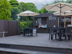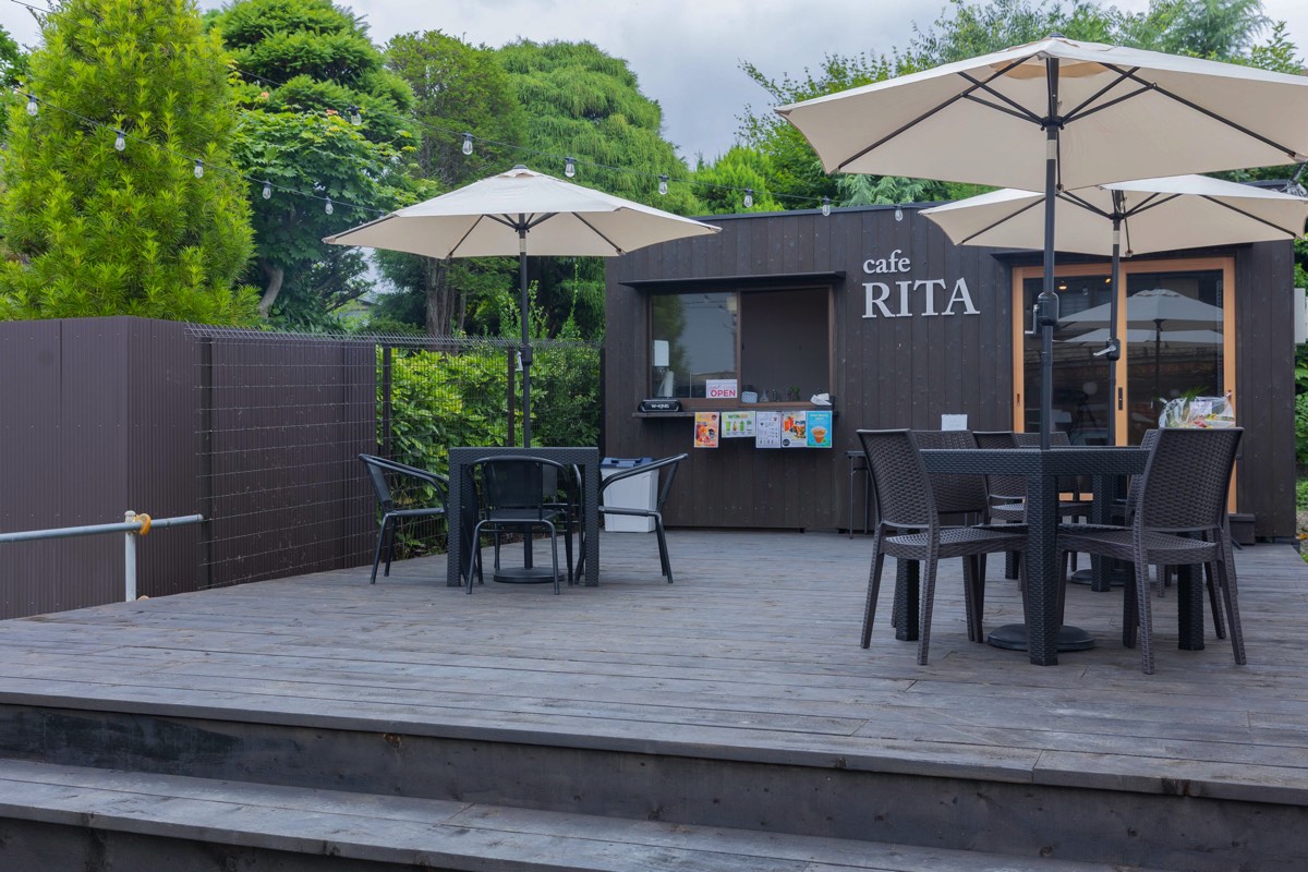 富士吉田市にあるカフェスタンド「cafeRITA」。レトロな商店街・本町通りからすぐで、テイクアウトはもちろん、テラス席や店内でひと休みすることもできる。