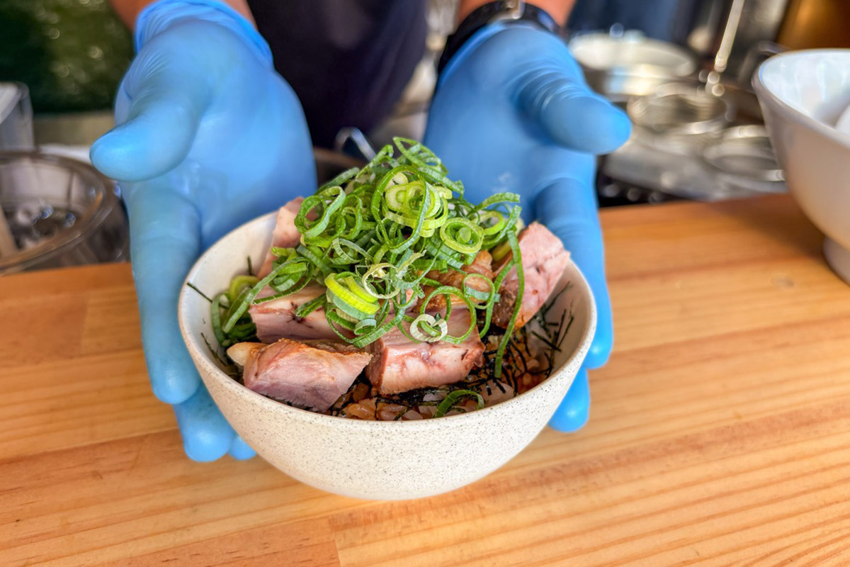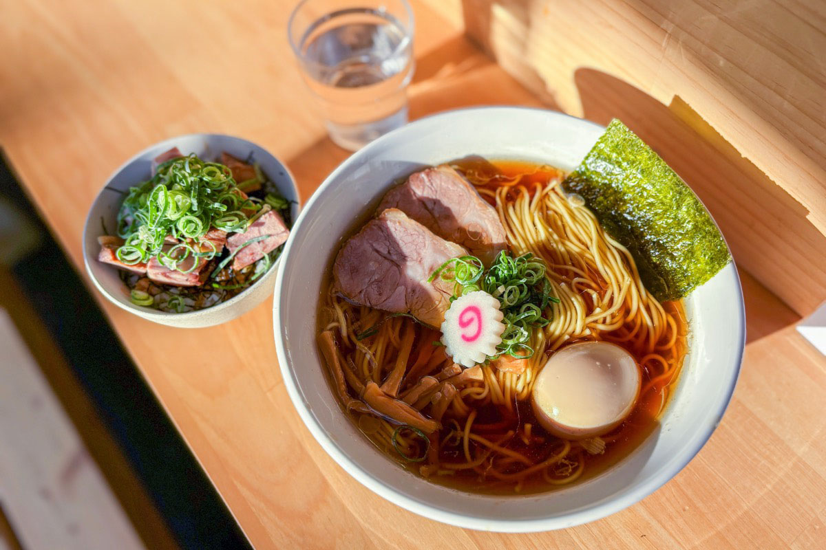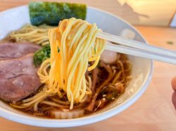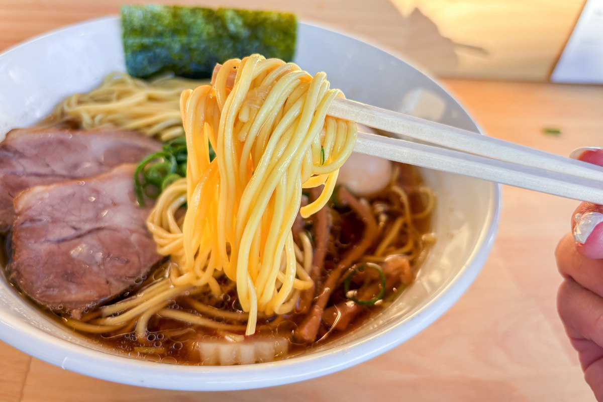 やさしい魚介の香りが鼻から抜け、醤油の立体感を感じる美しいスープと歯切れのいい中細ストレート麵。チャーシューは「フジザクラポーク」を使用。