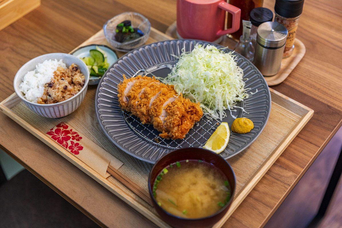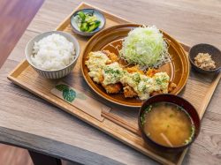 昼はヒレカツやロースカツ、日替りランチなどの定食、夜は特上ロースカツやハンバーグ定食、ひとくちひれかつなどの一品ものと、バラエティ豊富なメニューを揃える。