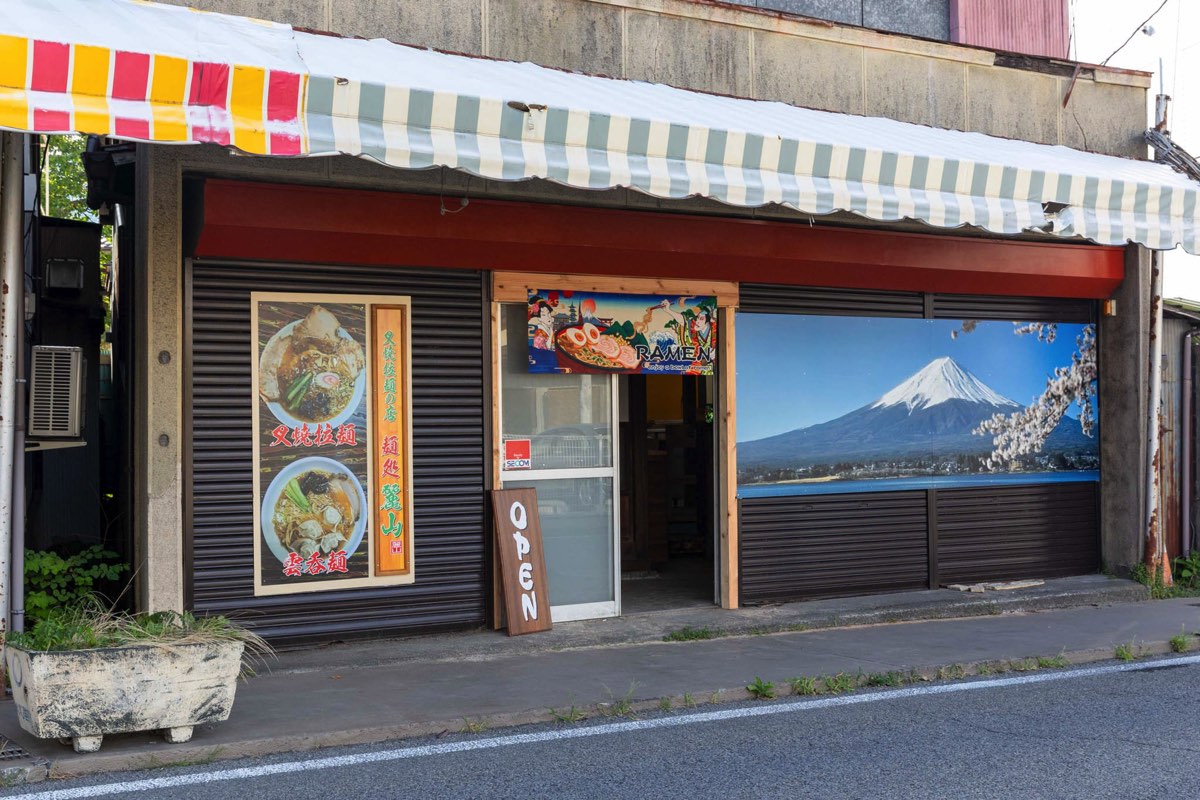 富士吉田市の吉田本町郵便局隣にある「麺処 麗山」は、ワンタン麵とチャーシュー麵が自慢のラーメン屋さん。富士山と桜の看板が目印。