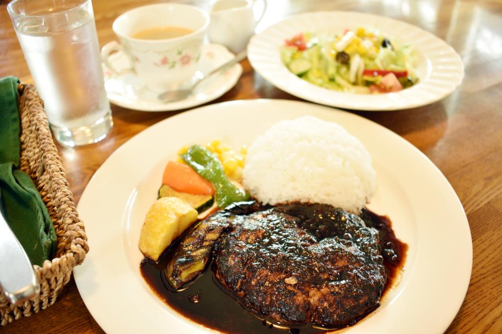 | 主なメニュー | ハンバーグステーキと素揚げ野菜のランチプレート 1,450円~ |