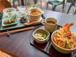 8時には朝食として、地元の「鬼塚玉子」で作る玉子焼きや炊き込みご飯、お味噌汁、小鉢などが揃う御膳、11時、13時の回には天丼と茶碗蒸し中心の御膳と、どちらも豪華なラインナップに。
