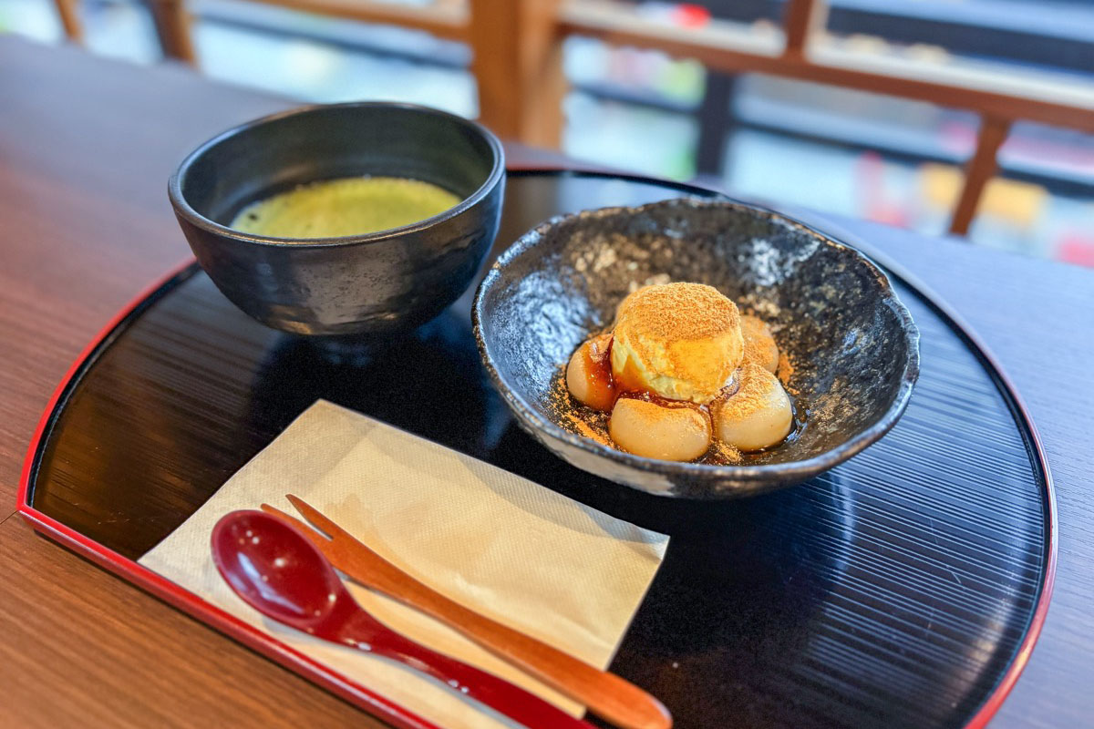 みたらしやきなこと黒蜜、あんこと黒蜜の3種類から選べるお団子に抹茶が付いたセットやあんみつ、ところてんと、ここならではのカフェメニューがラインナップ!
