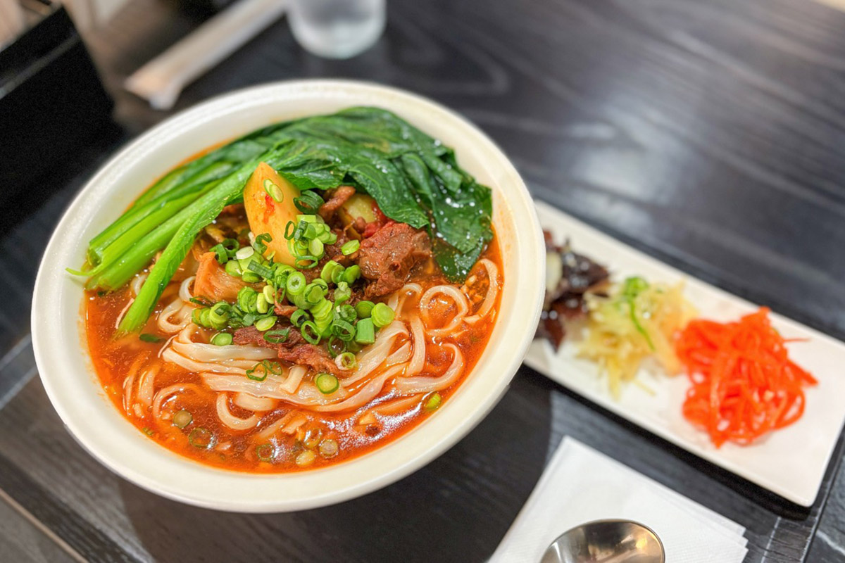 中でもおすすめはとろとろぷりぷりの牛すじの様々な食感が楽しい「牛すじラーメン」。ラーメンと言っても麺はうどんを使い、トマトたっぷりの甘みのあるスープが人気だ。