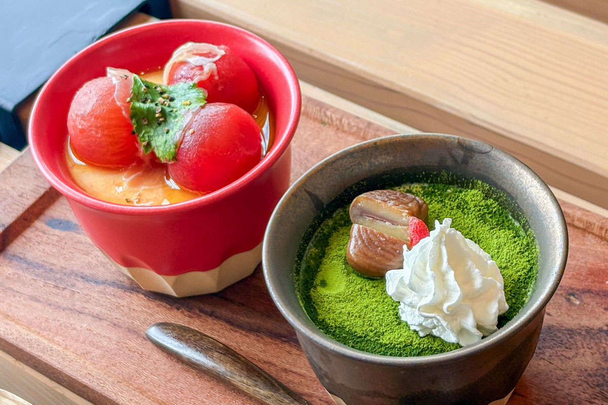 トマトと生ハムのチーズとろけるイタリアン風、えび団子の中華風のほか、プリンみたいな冷たいデザート系まで6種類が揃う。
