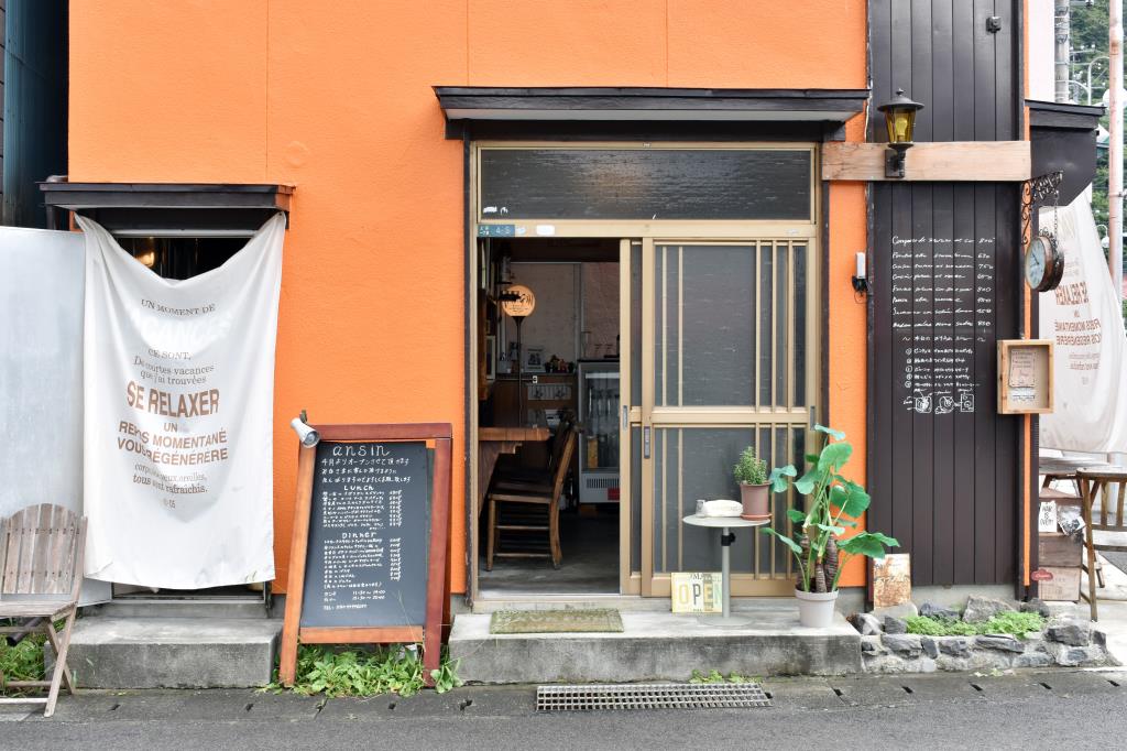 谷村町駅前にあるオレンジの壁が目を引く、古民家を改装したイタリアン・フレンチのお店。