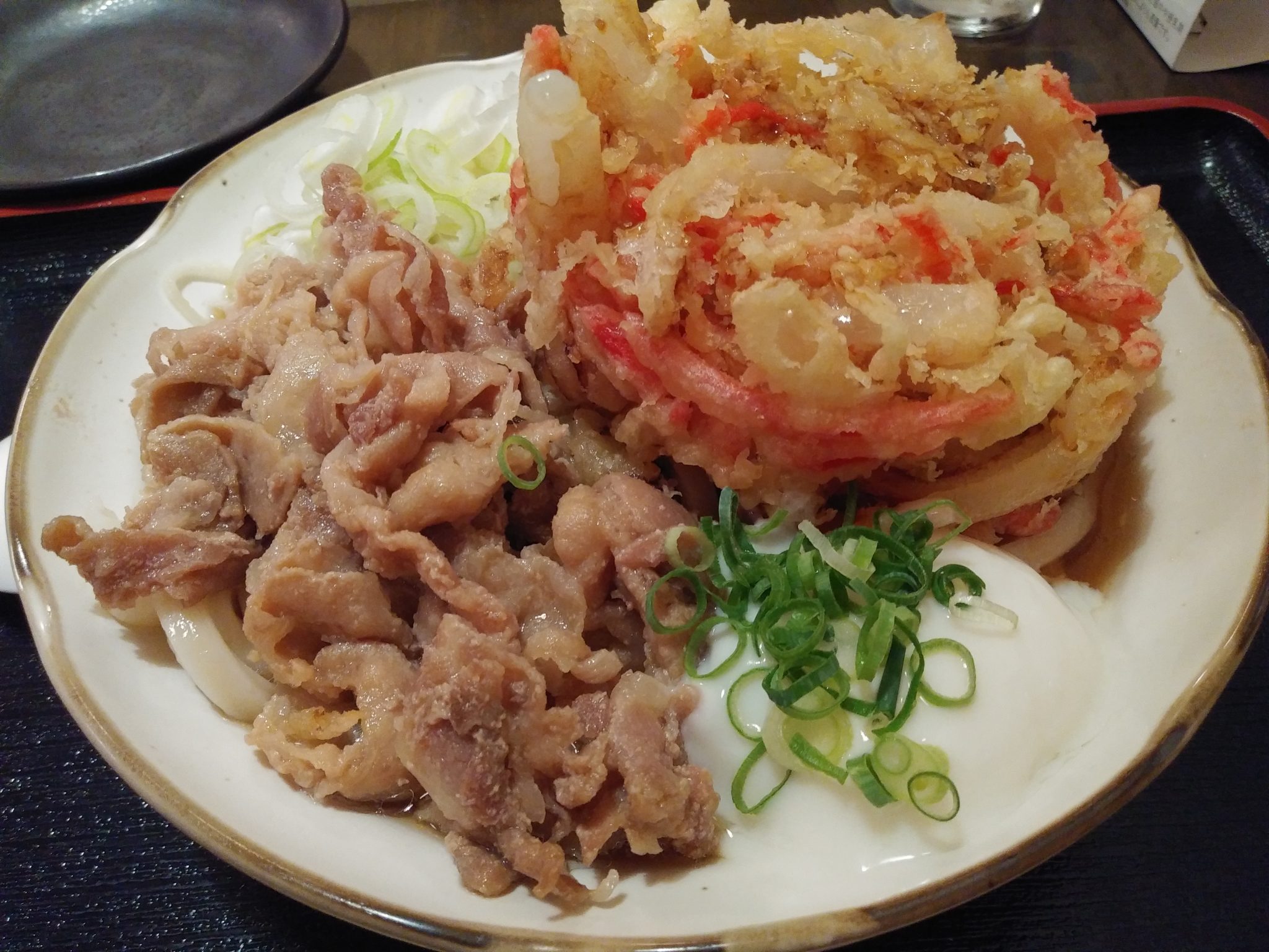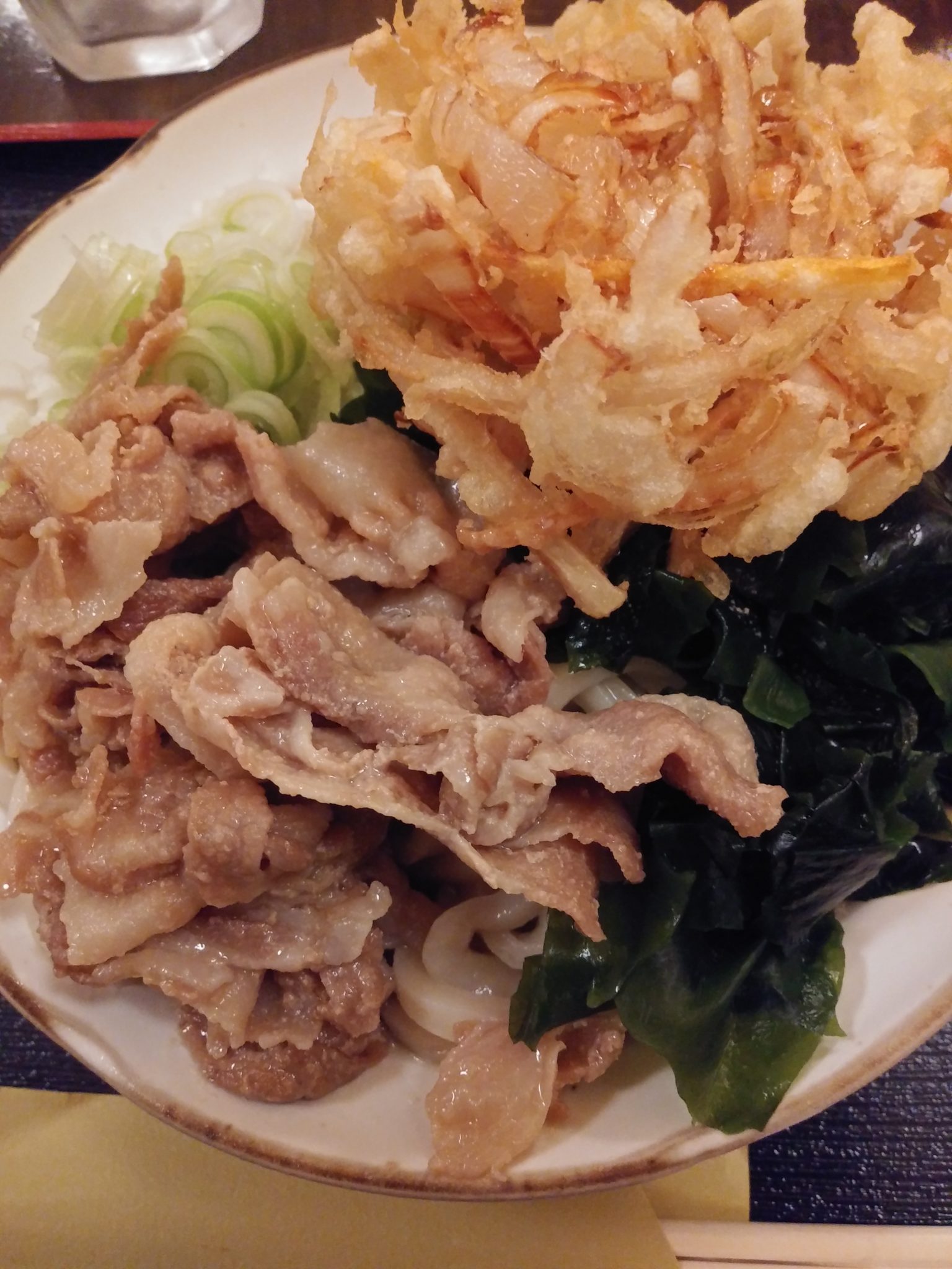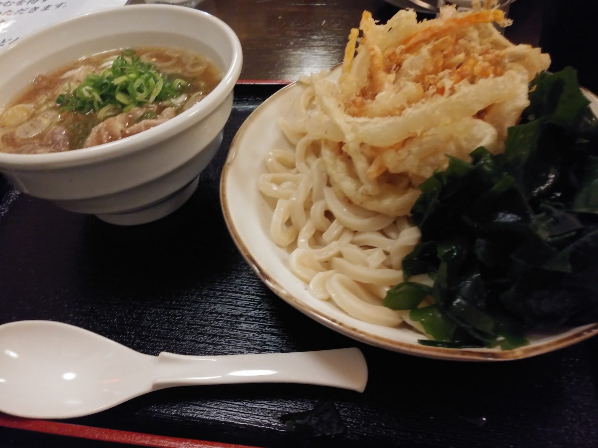 肉天つけうどんを頂きました。わかめトッピングです。吉田のうどん特有のコシがあるもちもちうどんが、とても美味しいです。かき揚げは大きくて、野菜の甘味が感じられ美味しい。今は税込み表記のはずなのに、メニューの金額と実際の会計金額が違いました。メニューは税抜き表記だったのでしょうか。伝票もレシートもなかったので、その辺り明瞭にして欲しいと思いました。