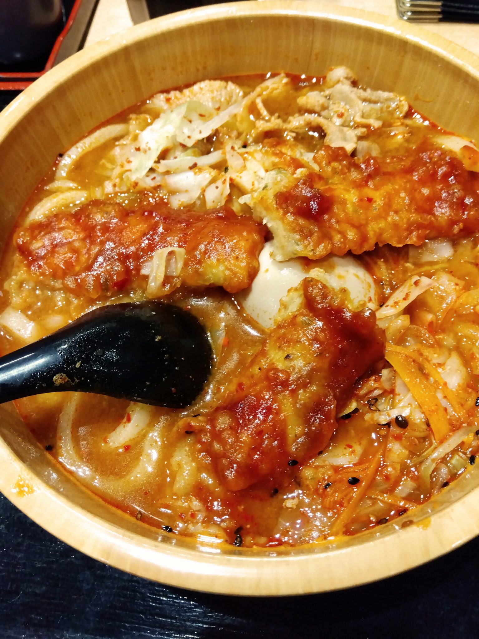 甲府でも、もちもち噛み応えのある吉田のうどんが頂けます。激辛チャレンジメニューがあり、辛い物が好きなので気になりましたが、今回は通常のうどんメニューにしました。味噌ベースのつけダレで、豚肉煮も美味しかったです。