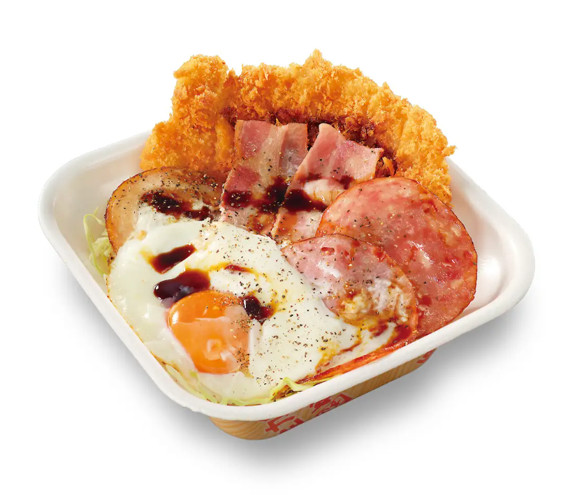チャーシュー、ベーコン、ボロニアソーセージエッグとロースカツを1度に楽しめる商品。