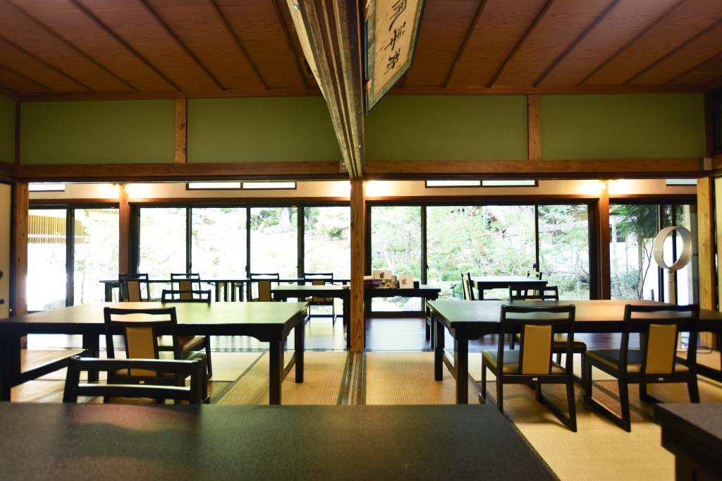 550年の歴史を持ち、目と学業の神様を祀る覚林坊。文化財に指定された庭を眺めながら食事を楽しめる。